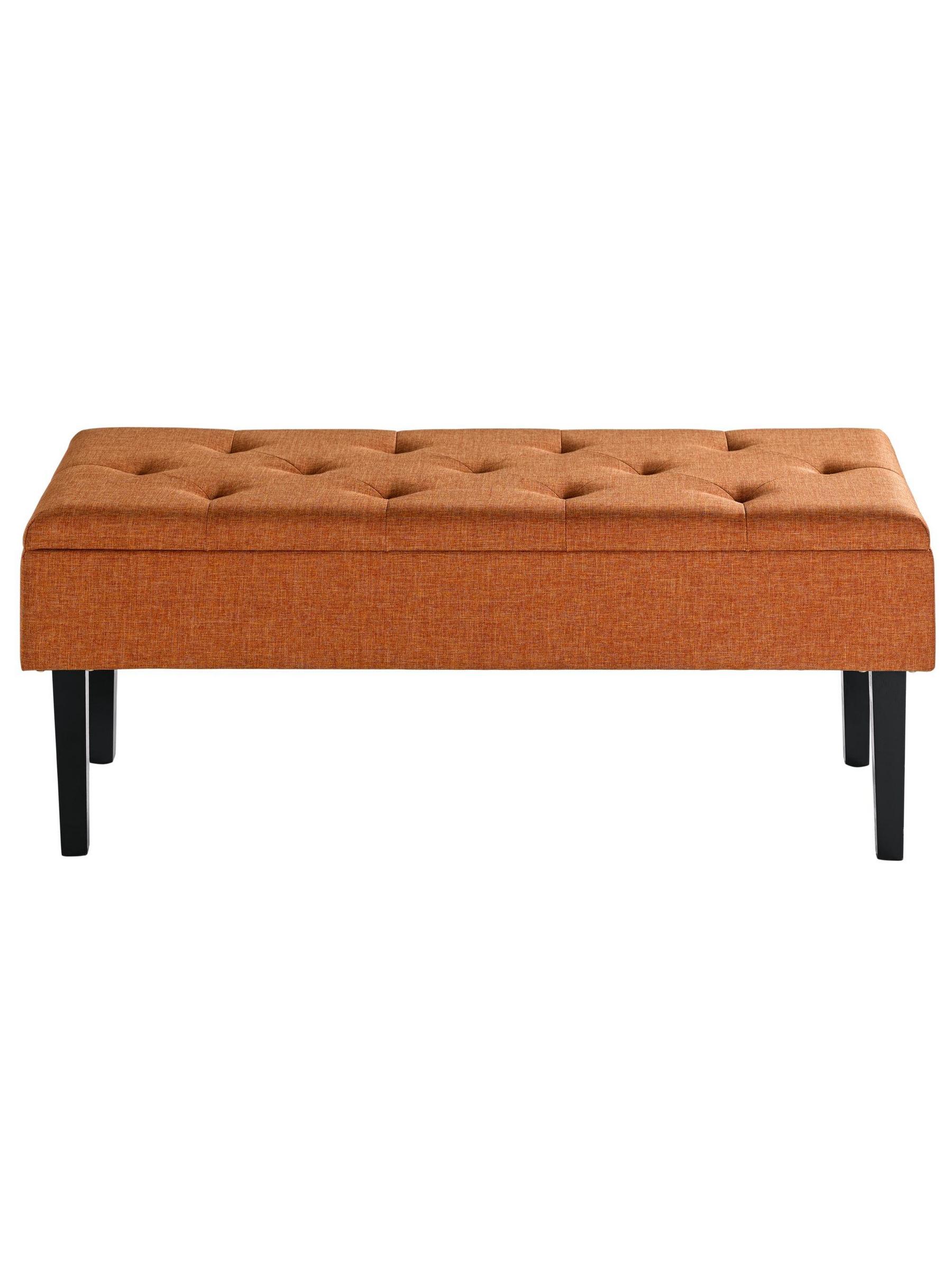 Diese elegante Bank ist ein vielseitiges Möbelstück mit einer praktischen Stauraumfunktion. Der aufklappbare Deckel ist mit einer bequemen Schaumstoffpolsterung und einer edlen Knopf-Heftung versehen, die für zusätzlichen Komfort sorgt. Darunter verbirgt sich ein großzügiger Stauraum, in dem sich viele Gegenstände verstauen lassen. Die Füße bestehen aus massivem Pinienholz, das schwarz lackiert wurde, während der strapazierfähige Stoffbezug aus 100% Polyester gefertigt ist. Diese Bank passt perfekt in jedes Wohnambiente und vereint Funktionalität mit Stil.