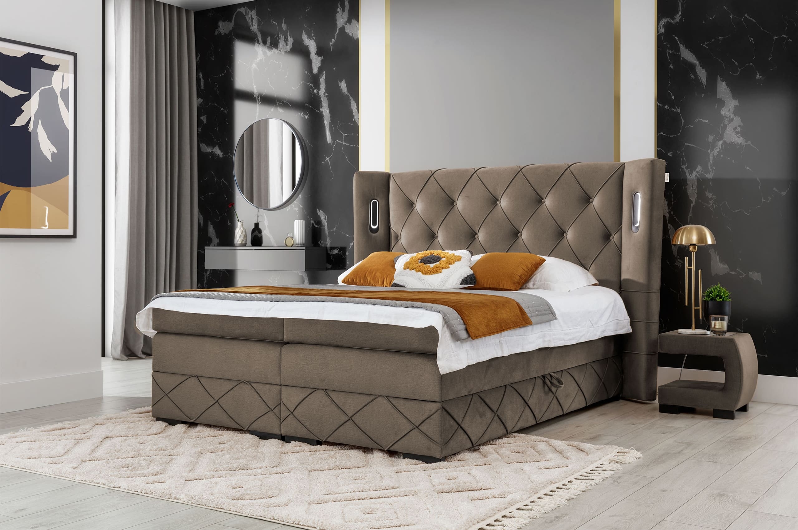 Das Boxspringbett "Aurelia Lux" bietet eine Synthese aus Stil und Funktionalität, perfekt für jedes Schlafzimmer. Es ist verfügbar in einer Palette von Farben und Größen, die zu jeder Raumgestaltung passen. Im Zentrum dieses modernen Schlafmöbels steht eine Taschenfederkernmatratze, die nicht nur für ergonomischen Schlafkomfort sorgt, sondern auch eine individuelle Körperanpassung ermöglicht. Das Boxspringbett-System, ein Merkmal für Langlebigkeit und Unterstützung, wird durch einen inkludierten Topper ergänzt, der den Liegekomfort noch weiter erhöht. Ein integrierter Bettkasten bietet praktischen Stauraum und hält das Schlafzimmer ordentlich. Für ein Ambiente der Ruhe und Entspannung sorgt die LED-Beleuchtung im Kopfteil, die eine sanfte Beleuchtung für die Abendstunden schafft. "Aurelia Lux" ist mehr als ein Bett, es ist eine Einladung zu erholsamem Schlaf in einem Möbelstück, das Design und Komfort meisterhaft vereint.
