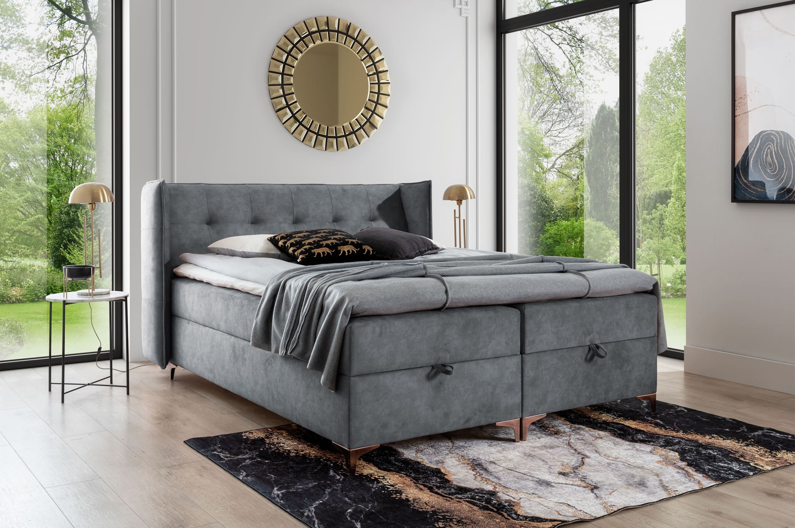 Das Boxspringbett "Elysium" ist ein Meisterstück der Schlafzimmermöbel, das Design, Funktionalität und erstklassigen Schlafkomfort geschickt kombiniert. Es verfügt über einen integrierten Bettkasten, der eine elegante Lösung für zusätzlichen Stauraum darstellt, perfekt, um Ihr Schlafzimmer frei von Unordnung zu halten. Im Herzen des "Elysium" liegt eine hochwertige Taschenfederkernmatratze, die für ihre hervorragende Anpassungsfähigkeit an die Konturen des Körpers und für die exzellente Druckverteilung bekannt ist. Dies gewährleistet ein Höchstmaß an Unterstützung und Komfort über die gesamte Liegefläche. Zur Komplettierung des luxuriösen Schlaferlebnisses gehört ein inkludierter Topper, der die Matratze schützt und gleichzeitig eine zusätzliche Schicht aus weichem, aber festem Komfort bietet. Mit dem "Elysium" Boxspringbett laden Sie Eleganz und Komfort in Ihr Schlafzimmer ein und schaffen einen Ort, an dem jede Nacht zur erholsamen Flucht wird.