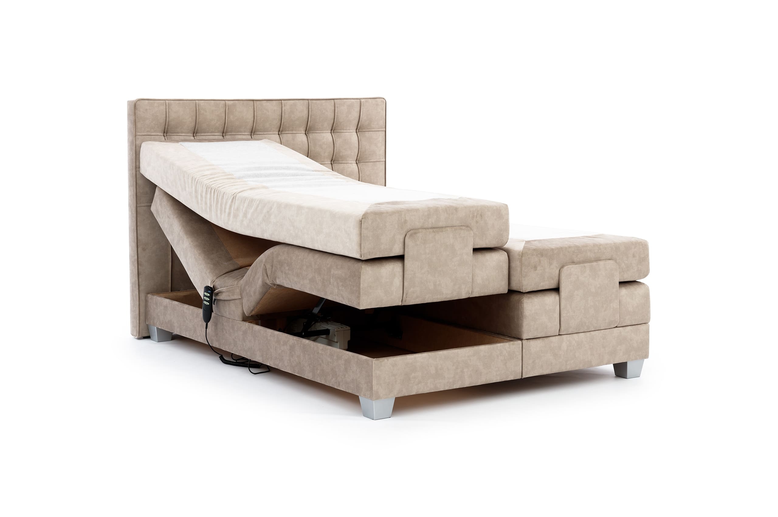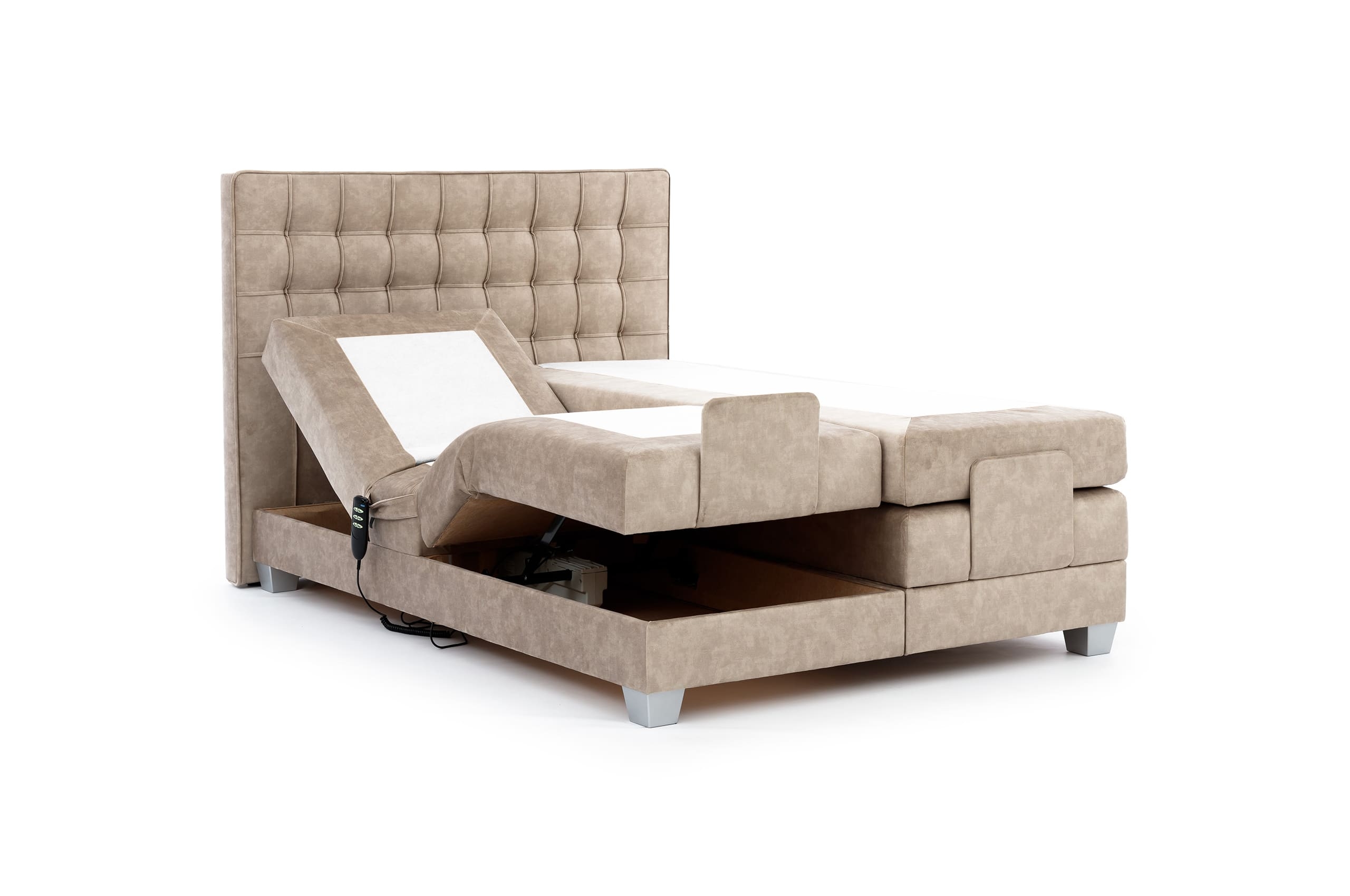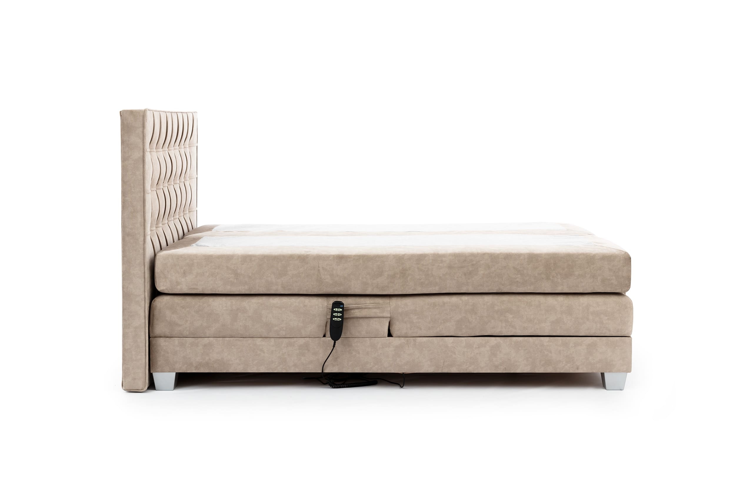 Das Boxspringbett "Serena" setzt neue Maßstäbe für luxuriösen Schlafkomfort mit technischer Raffinesse. Dieses exquisit gestaltete Bett verfügt über ein gestepptes Kopfteil, das nicht nur optisch ansprechend ist, sondern auch eine gemütliche Stütze beim Lesen oder Entspannen bietet. Ein besonderes Highlight ist der eingebaute Bettkasten, der zusätzlichen Stauraum bietet, um Ihr Schlafzimmer ordentlich und frei von Unordnung zu halten. Über der robusten Stahlrahmenkonstruktion liegt eine hochwertige Taschenfederkernmatratze, die sich perfekt an Ihren Körper anpasst und für optimalen Schlafkomfort sorgt. Das "Serena" hebt sich durch seine motorisierte Verstellbarkeit ab, die es Ihnen ermöglicht, die Kopf- und Fußpositionen einfach per Knopfdruck zu ändern alles bequem steuerbar mit einer zugehörigen Fernbedienung. Der inkludierte Topper ergänzt den Komfort, indem er eine weiche, nachgiebige Schicht bildet, die den Körper sanft umhüllt. Mit dem Boxspringbett "Serena" genießen Sie nicht nur eine erholsame Nachtruhe, sondern auch den Luxus und die Bequemlichkeit einer personalisierten Schlafumgebung.