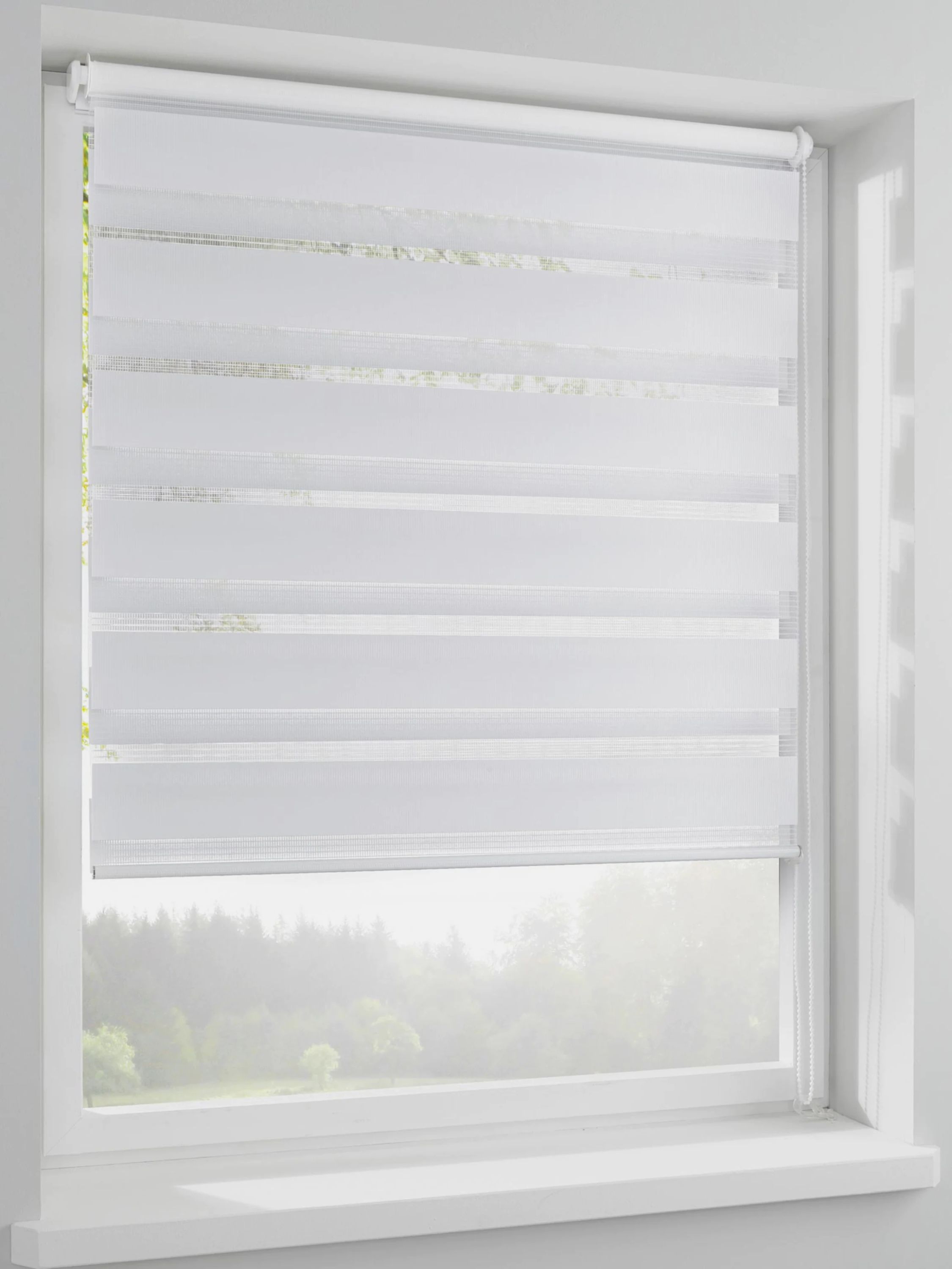 Dieses Doppelrollo bietet leichte Transparenz bis hin zu Licht- und Sichtschutz. Einfache Montage am Fensterrahmen, ohne Werkzeug.