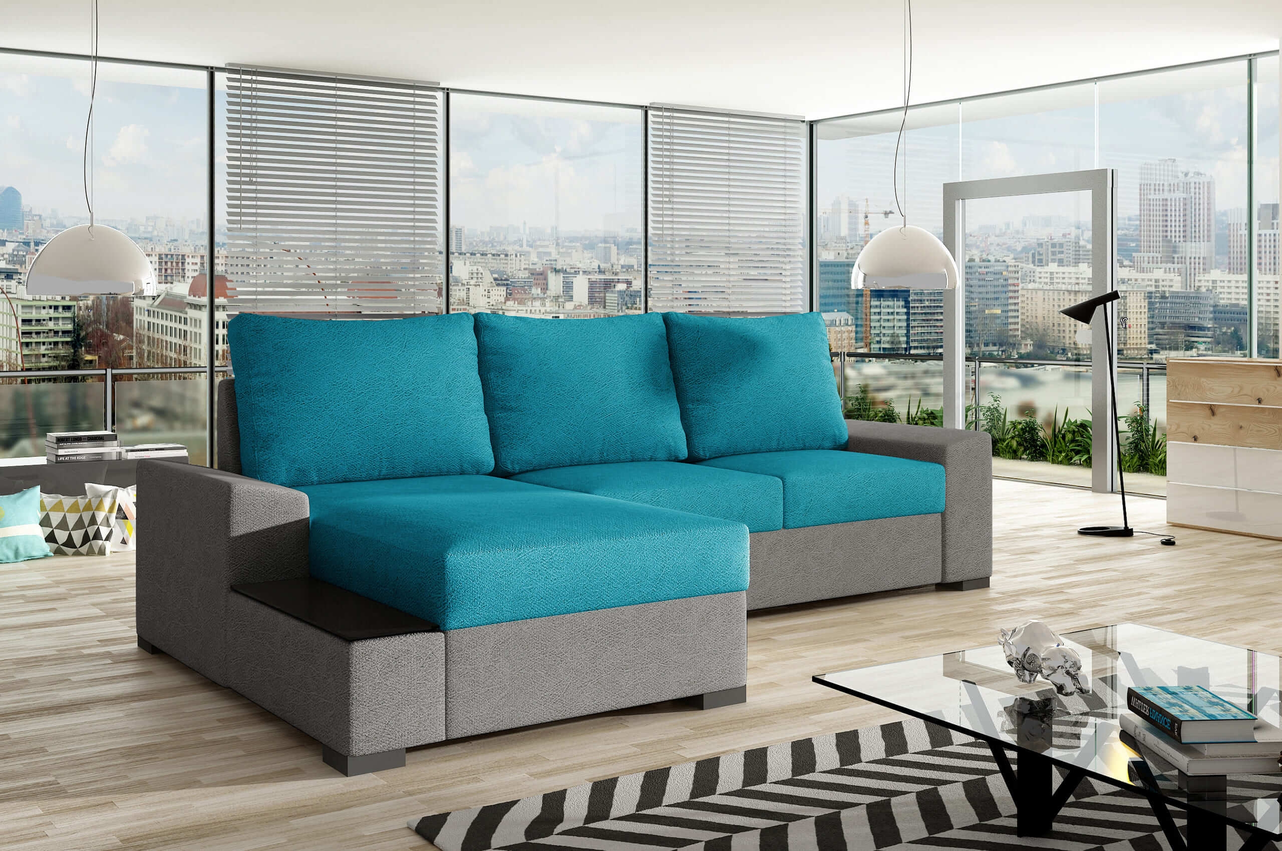 Das Ecksofa Loco ist die perfekte Kombination aus Funktionalität und Stil. Mit seiner Schlaffunktion und dem geräumigen Bettkasten bietet es Ihnen zusätzlichen Schlafplatz und Stauraum für Decken und Kissen. Die atmungsaktive Polyätherschaumpolsterung und die Wellenunterfederung sorgen für einen angenehmen Sitz- und Liegekomfort. Die Holzfüße verleihen dem Sofa eine moderne Note, während die elegante Armlehnenverlängerung mit Glasakzent nicht nur als Ablage, sondern auch als stilvolles Detail dient. Die großzügigen Sitzkissen bieten ausreichend Platz zum Entspannen. Verfügbar in verschiedenen Farben und Stoffen, können Sie das Ecksofa Loco perfekt an Ihren Einrichtungsstil anpassen und Ihrem Wohnzimmer eine elegante Note verleihen.