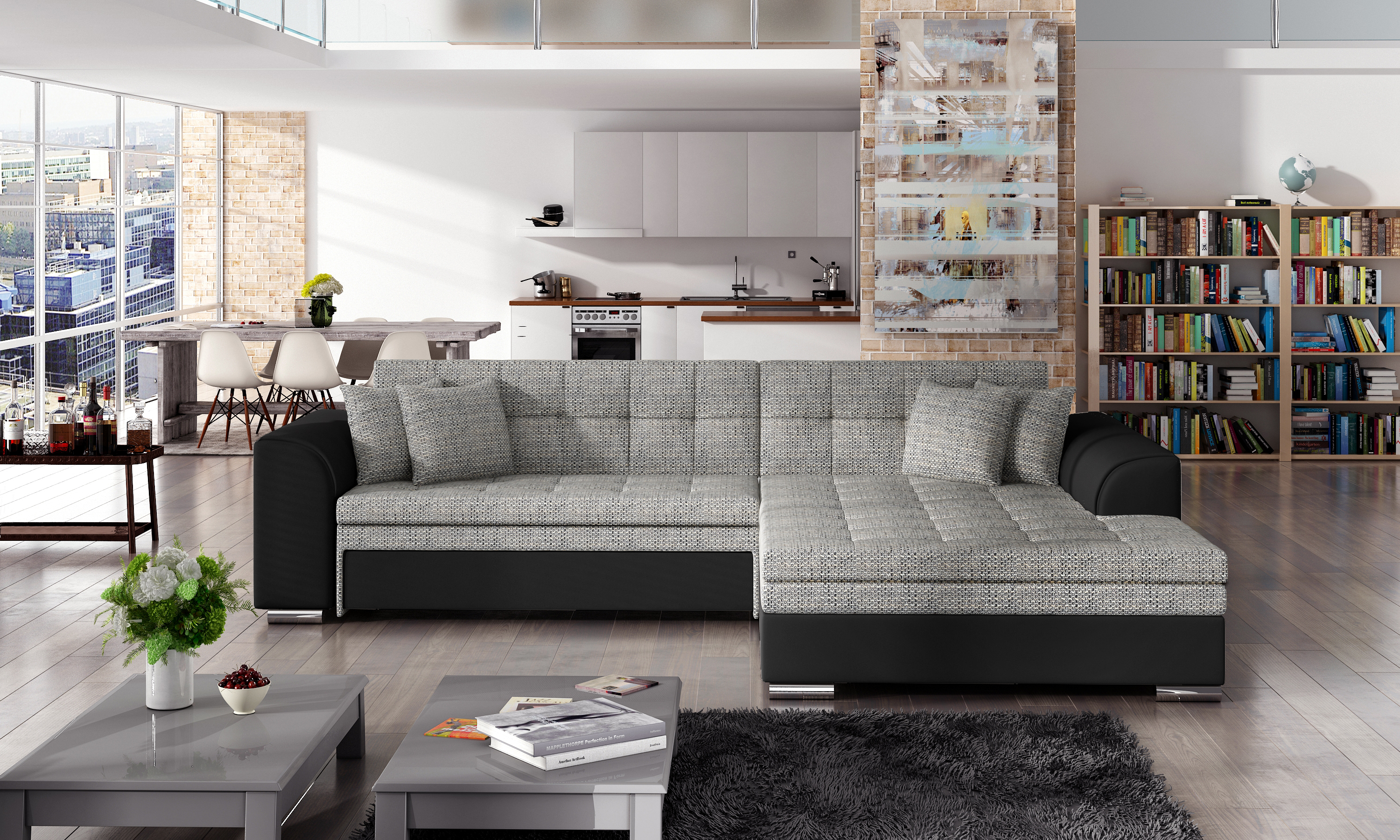 Tauchen Sie ein in den Komfort und die Eleganz des Ecksofas "Sarento". Dieses vielseitige Sofa ist in verschiedenen Farbkombinationen erhältlich und bietet Ihnen die Möglichkeit, Ihren Wohnraum ganz nach Ihren Vorstellungen zu gestalten. Mit seiner Schlaffunktion und geräumigen Sitzen ist es ideal für Gäste oder entspannte Abende zu zweit. Die ausprofilierte Rückenlehne und die abgerundeten Armlehnen sorgen für maximalen Komfort und Stil. Die verchromten Füße verleihen dem Sofa einen modernen Touch, während die stilvolle Steppung das Design komplettiert. Erleben Sie Komfort und Funktionalität in einem Möbelstück mit dem Ecksofa "Sarento".