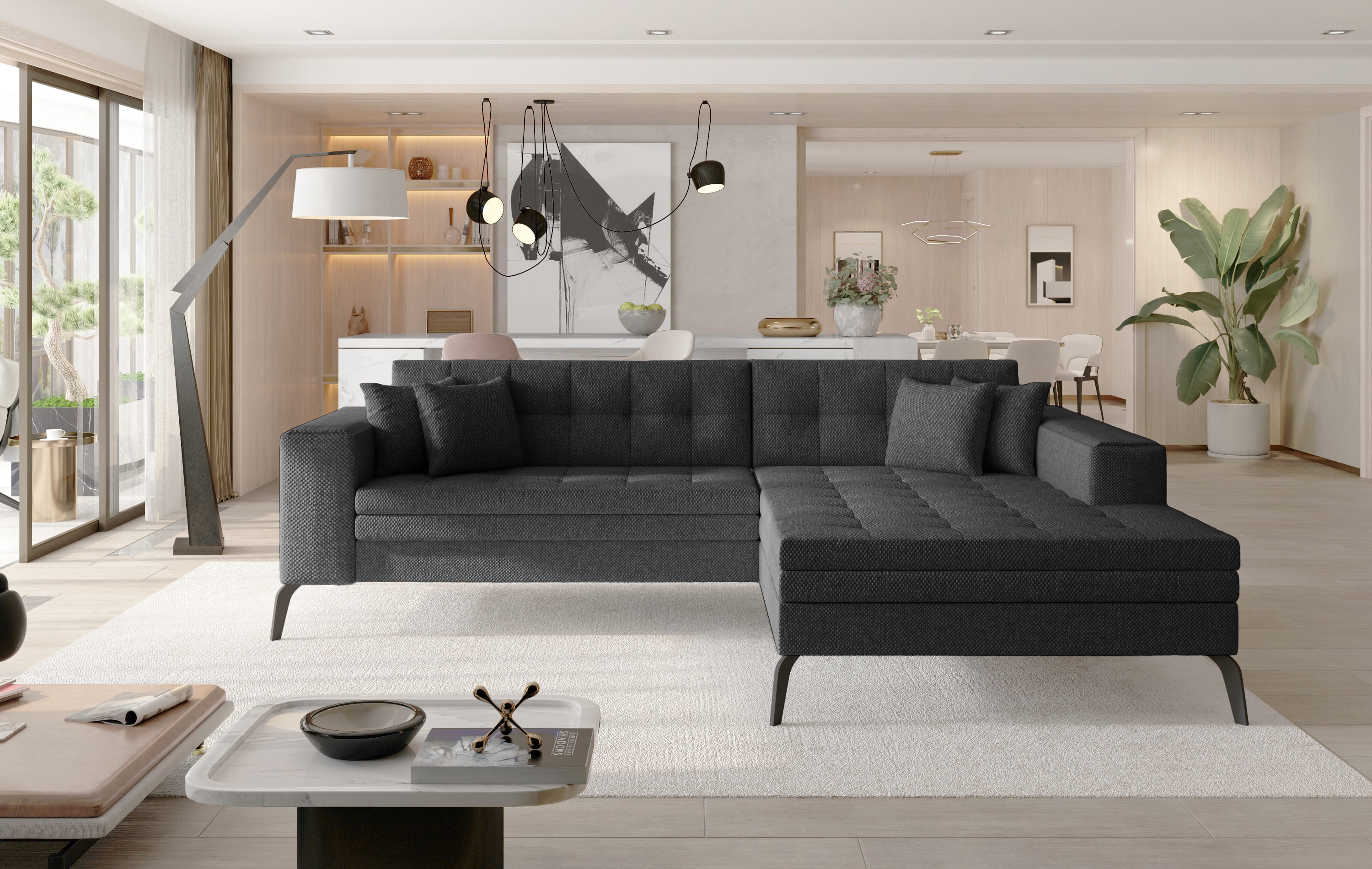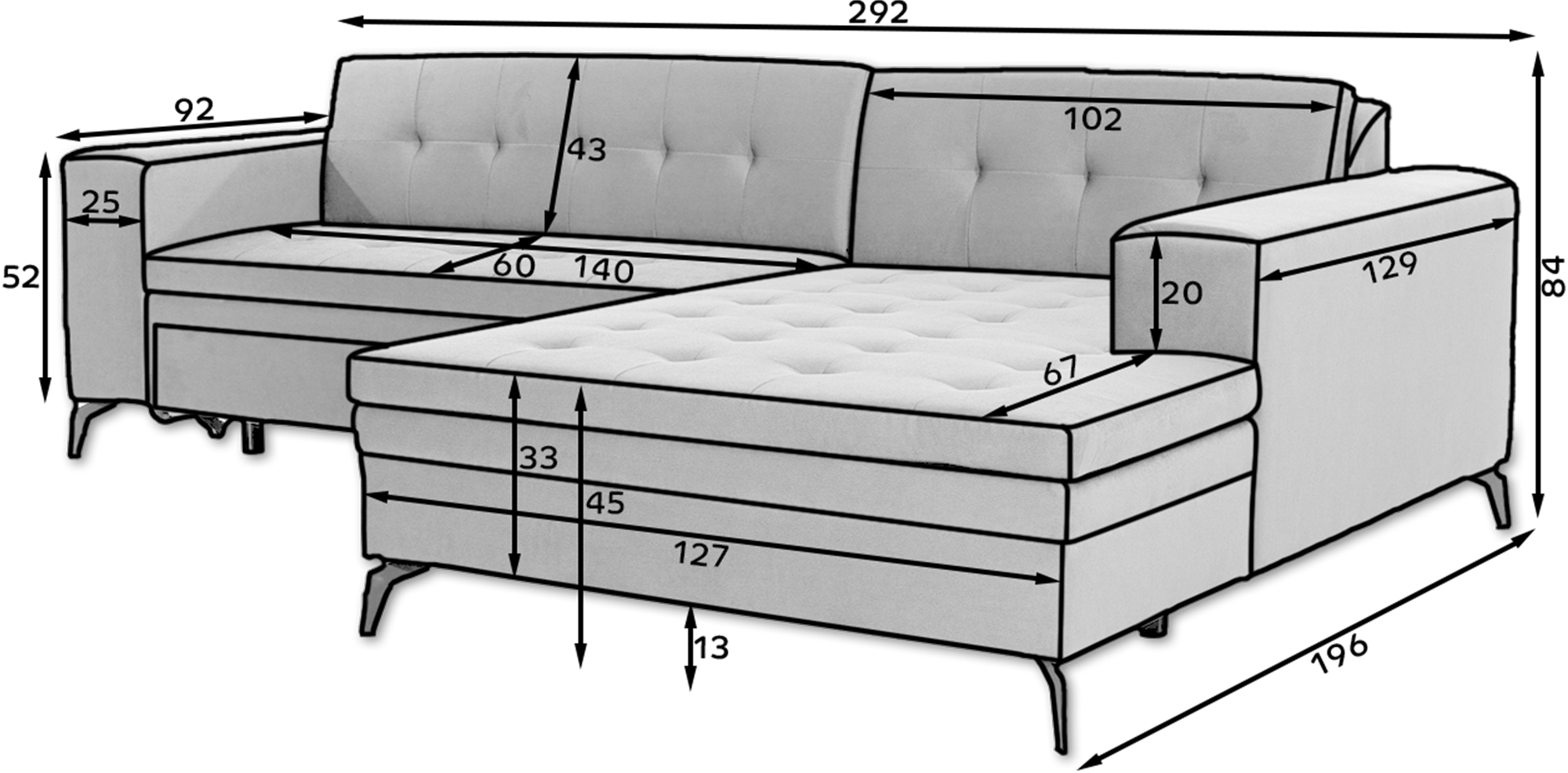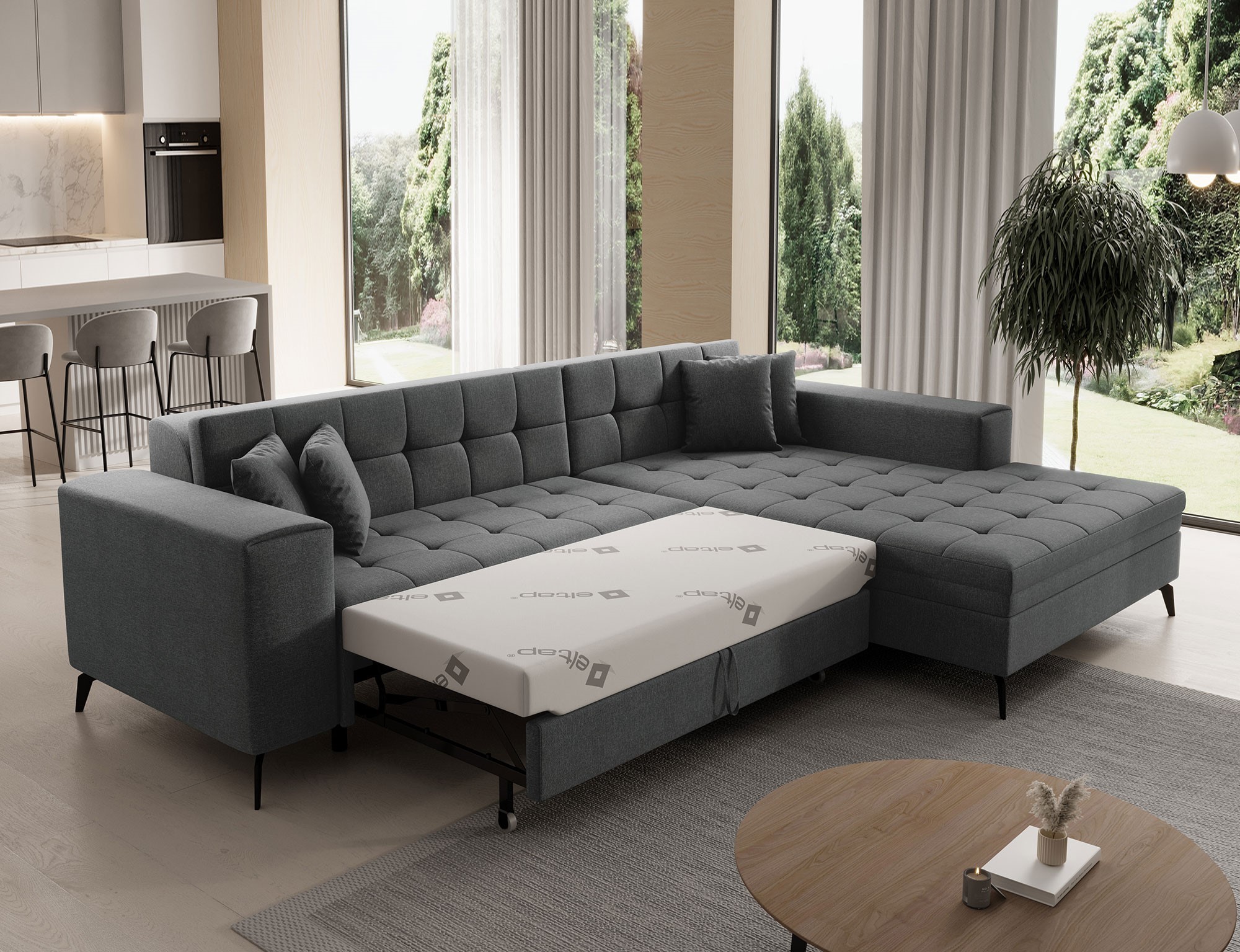 Das Ecksofa Sokka verleiht deinem Wohnraum eine luxuriöse und frische Atmosphäre. Mit seinen großzügigen Maßen von 292 x 196 x 84 cm bietet es der ganzen Familie maximalen Komfort – ob tagsüber oder in der Nacht. Dank der integrierten Schlaffunktion und einer Liegefläche von 242 x 123 cm lässt sich das Sofa mit dem benutzerfreundlichen Delfin-Mechanismus mühelos in ein Bett verwandeln.