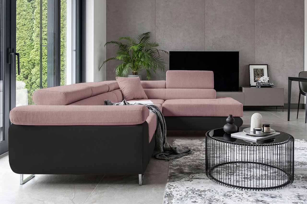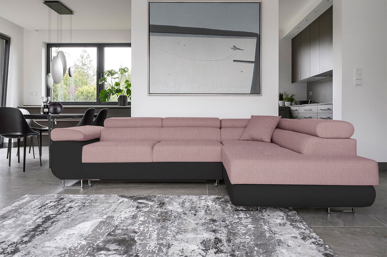 Das Ecksofa Tons vereint robuste Konstruktion mit ansprechenden Details, die seinem Design Raffinesse verleihen. Die leicht abgerundeten Seitenteile und die breite Armlehne verleihen ihm eine moderne Ästhetik, während die hohen, verchromten Metallfüße in Hochglanz das Gesamtbild elegant abrunden. Die dezenten Steppungen und Nähte auf den Sitzflächen sowie die bequemen Kopfstützen sorgen für zusätzlichen Komfort und einen Hauch von Luxus. Besonders praktisch sind die drei verstellbaren Kopfstützen, die es ermöglichen, das Sofa individuell an die Bedürfnisse und Vorlieben anzupassen und den Erholungskomfort erheblich verbessern. Mit seiner Schlaffunktion bietet das Ecksofa Tons auch eine praktische Lösung für Übernachtungsgäste, während der integrierte Bettkasten zusätzlichen Stauraum für Bettwäsche oder andere Utensilien bietet. Entdecken Sie das Ecksofa Tons und verwandeln Sie Ihr Wohnzimmer in eine stilvolle und komfortable Oase der Entspannung.