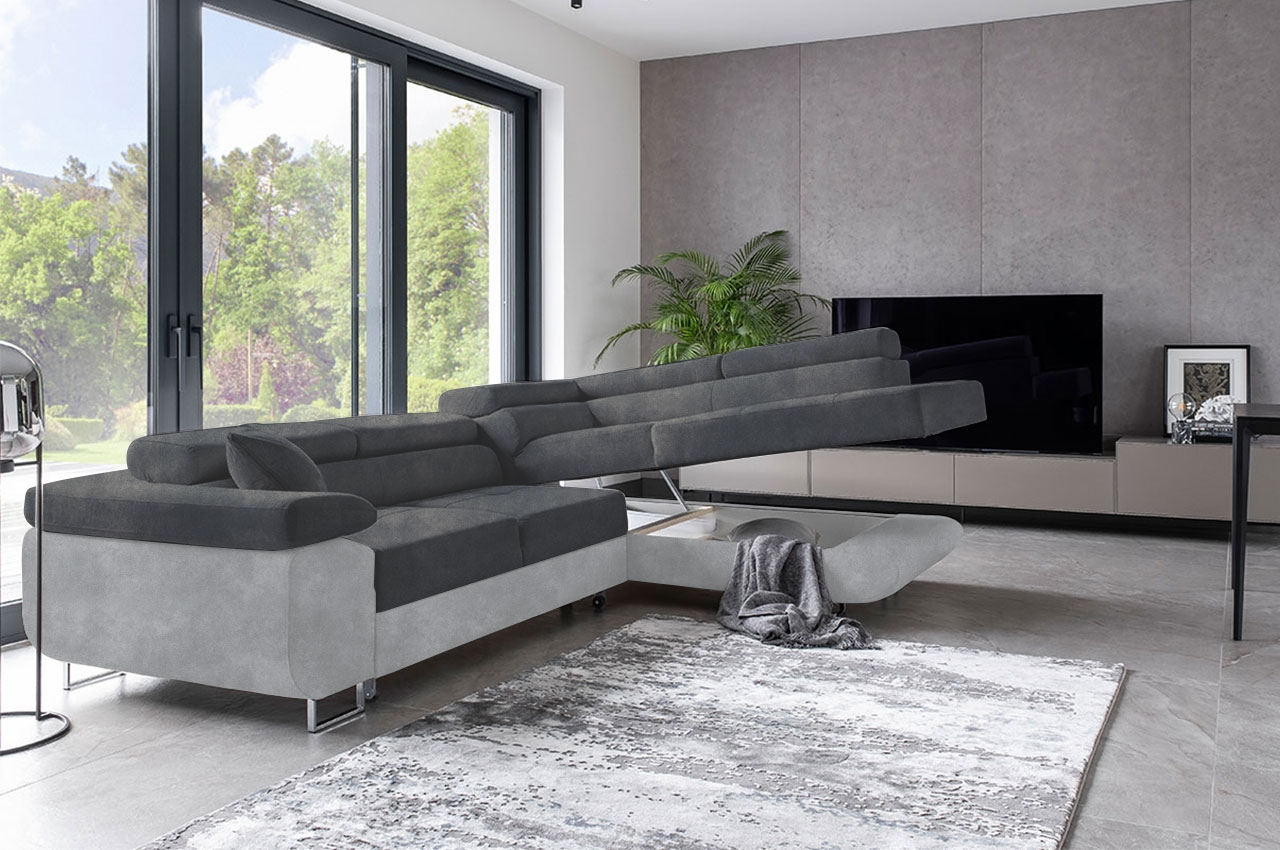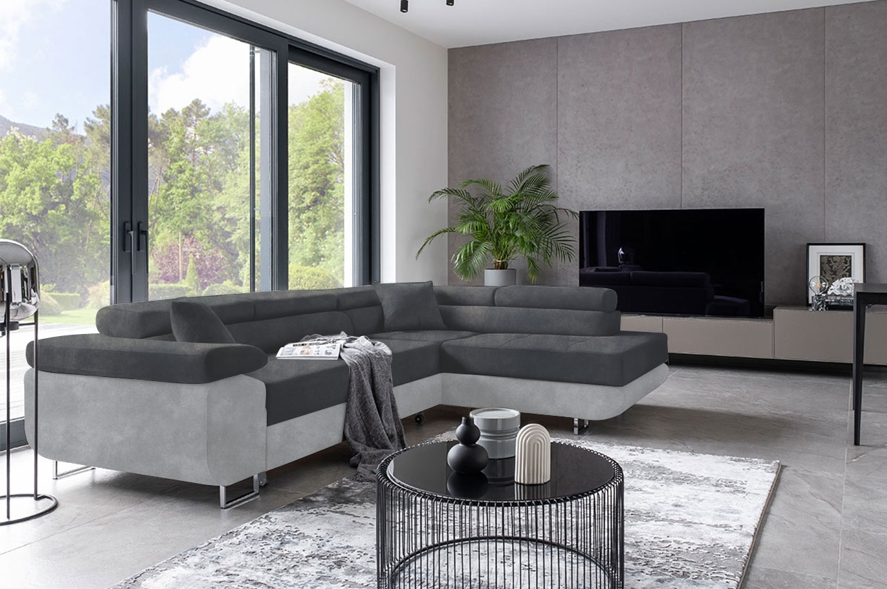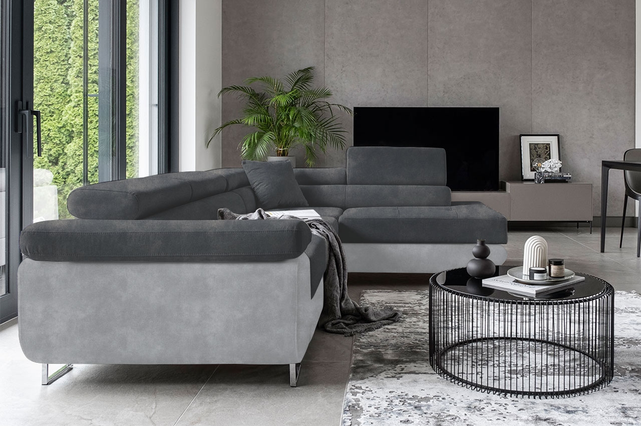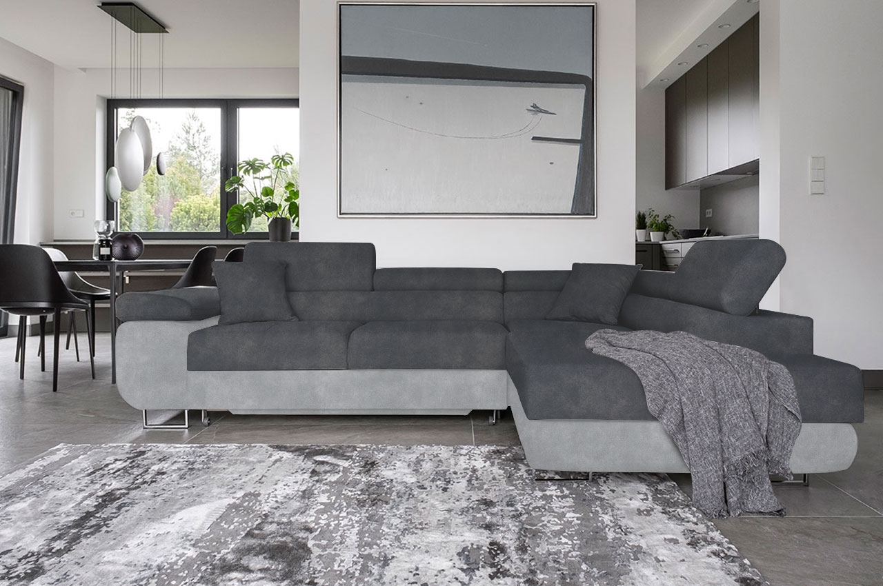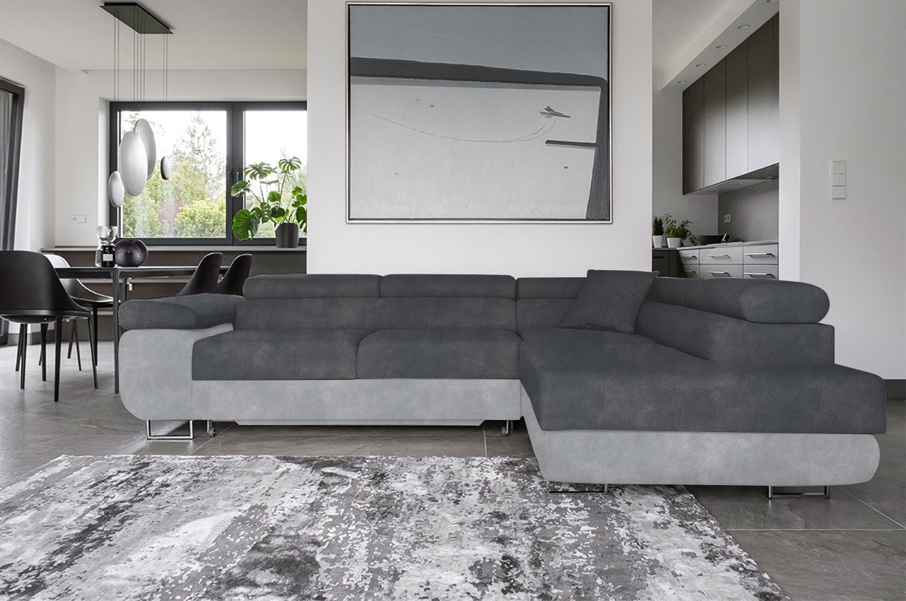 Das Ecksofa Tons vereint robuste Konstruktion mit ansprechenden Details, die seinem Design Raffinesse verleihen. Die leicht abgerundeten Seitenteile und die breite Armlehne verleihen ihm eine moderne Ästhetik, während die hohen, verchromten Metallfüße in Hochglanz das Gesamtbild elegant abrunden. Die dezenten Steppungen und Nähte auf den Sitzflächen sowie die bequemen Kopfstützen sorgen für zusätzlichen Komfort und einen Hauch von Luxus. Besonders praktisch sind die drei verstellbaren Kopfstützen, die es ermöglichen, das Sofa individuell an die Bedürfnisse und Vorlieben anzupassen und den Erholungskomfort erheblich verbessern. Mit seiner Schlaffunktion bietet das Ecksofa Tons auch eine praktische Lösung für Übernachtungsgäste, während der integrierte Bettkasten zusätzlichen Stauraum für Bettwäsche oder andere Utensilien bietet. Entdecken Sie das Ecksofa Tons und verwandeln Sie Ihr Wohnzimmer in eine stilvolle und komfortable Oase der Entspannung.