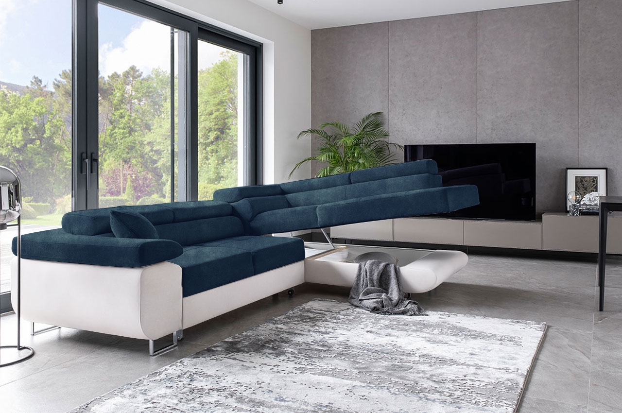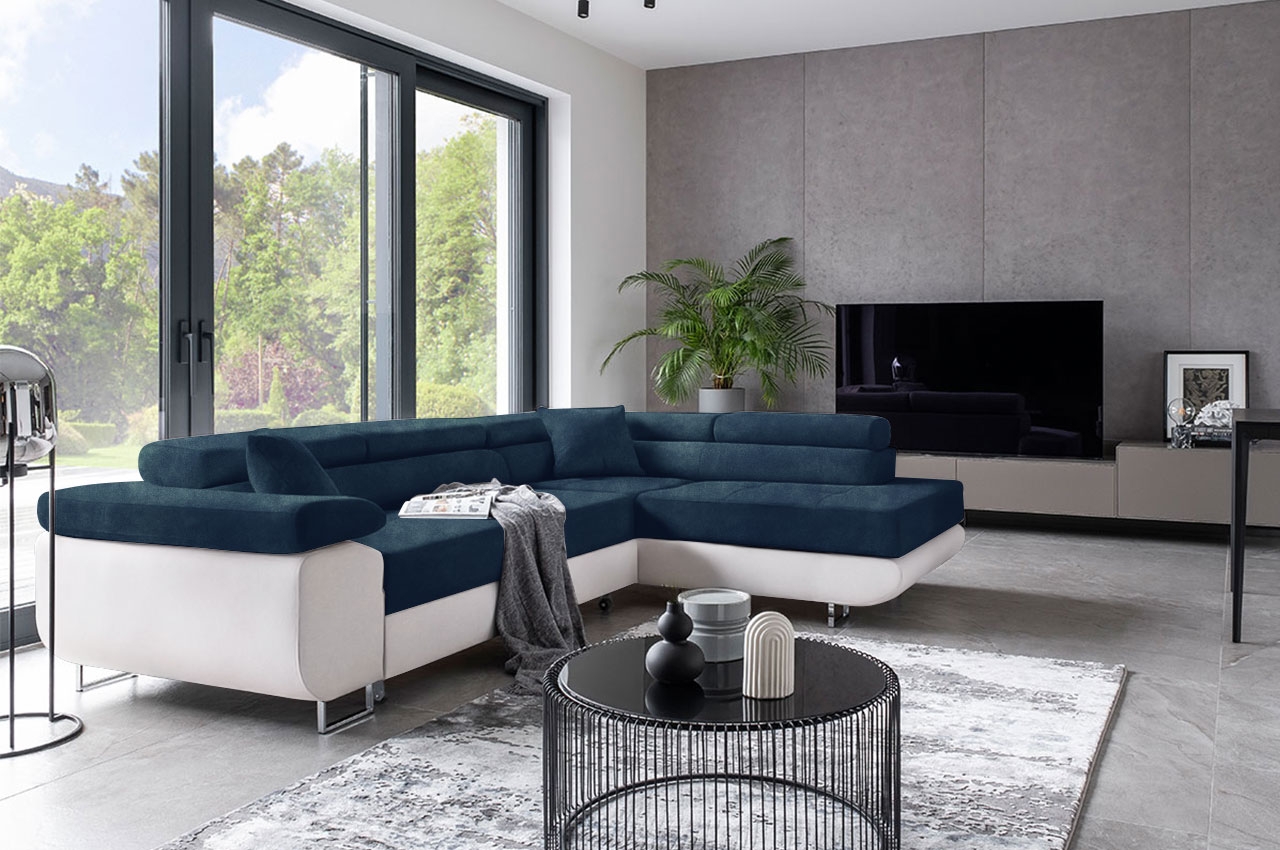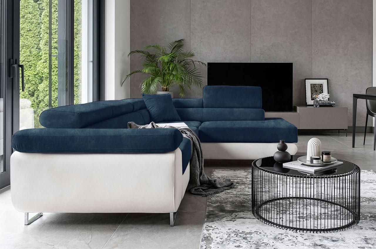 Das Ecksofa Tons vereint robuste Konstruktion mit ansprechenden Details, die seinem Design Raffinesse verleihen. Die leicht abgerundeten Seitenteile und die breite Armlehne verleihen ihm eine moderne Ästhetik, während die hohen, verchromten Metallfüße in Hochglanz das Gesamtbild elegant abrunden. Die dezenten Steppungen und Nähte auf den Sitzflächen sowie die bequemen Kopfstützen sorgen für zusätzlichen Komfort und einen Hauch von Luxus. Besonders praktisch sind die drei verstellbaren Kopfstützen, die es ermöglichen, das Sofa individuell an die Bedürfnisse und Vorlieben anzupassen und den Erholungskomfort erheblich verbessern. Mit seiner Schlaffunktion bietet das Ecksofa Tons auch eine praktische Lösung für Übernachtungsgäste, während der integrierte Bettkasten zusätzlichen Stauraum für Bettwäsche oder andere Utensilien bietet. Entdecken Sie das Ecksofa Tons und verwandeln Sie Ihr Wohnzimmer in eine stilvolle und komfortable Oase der Entspannung.
