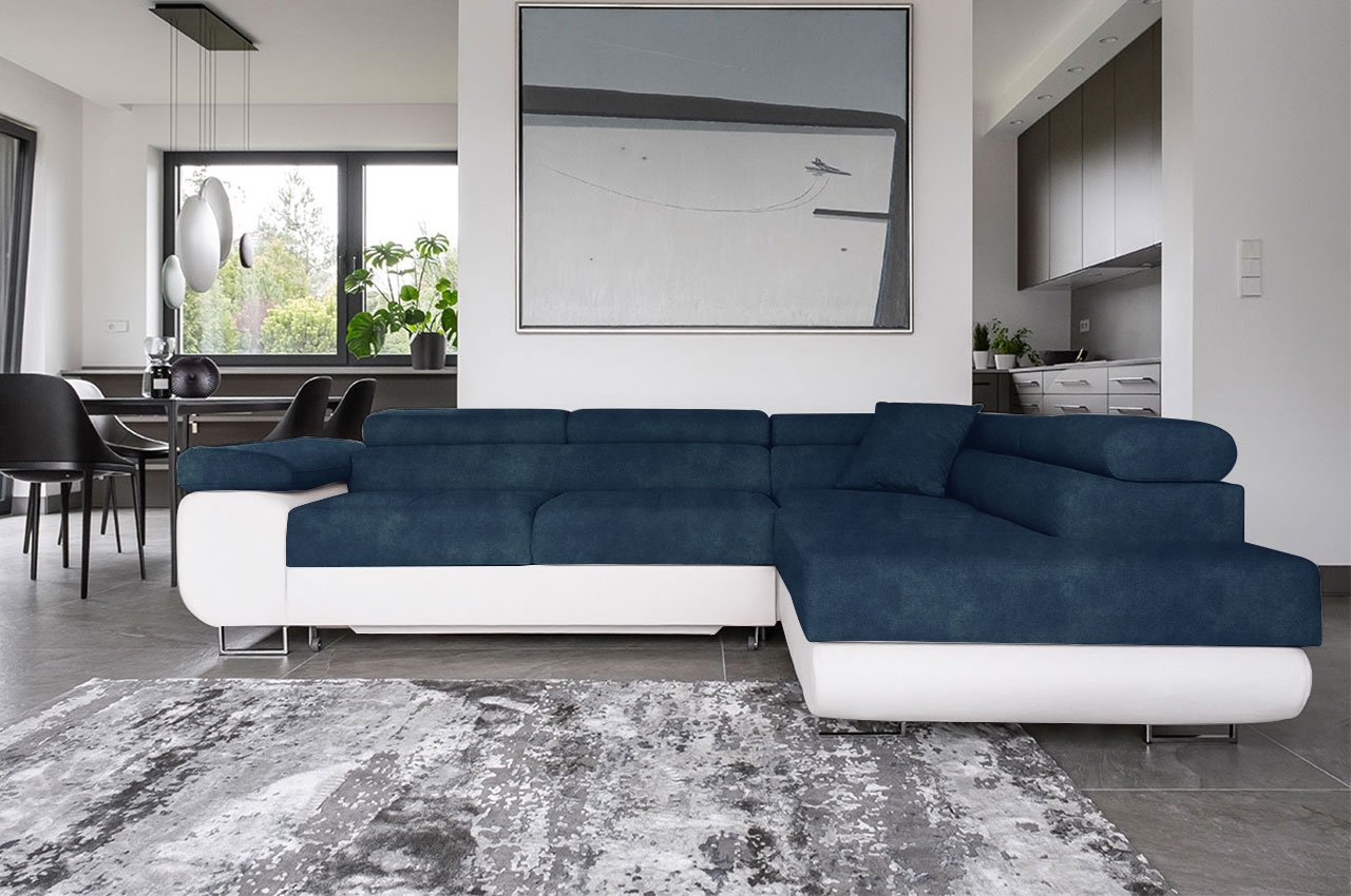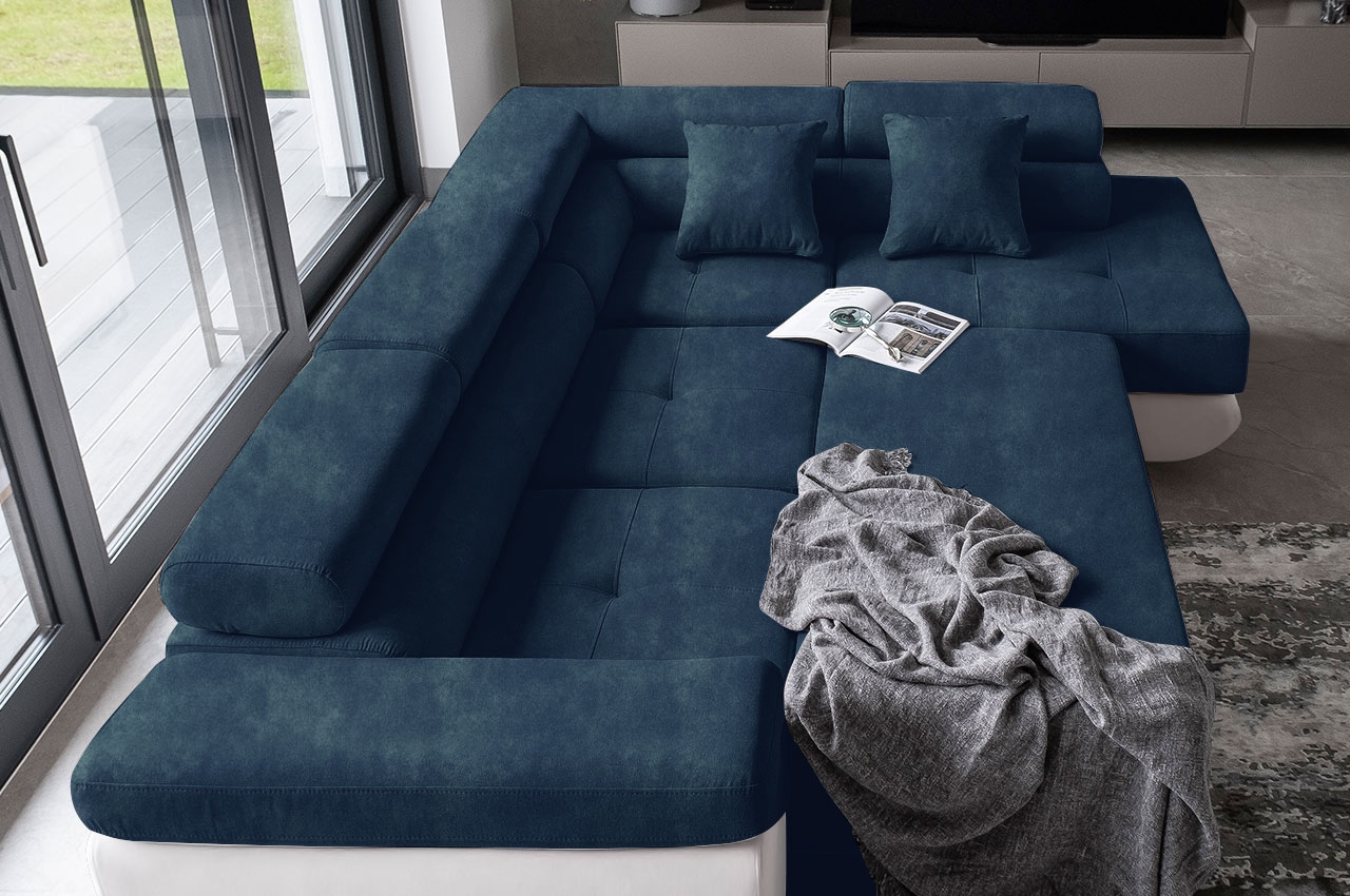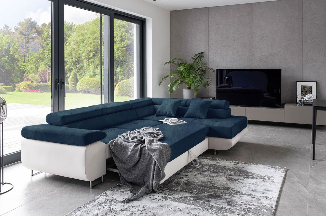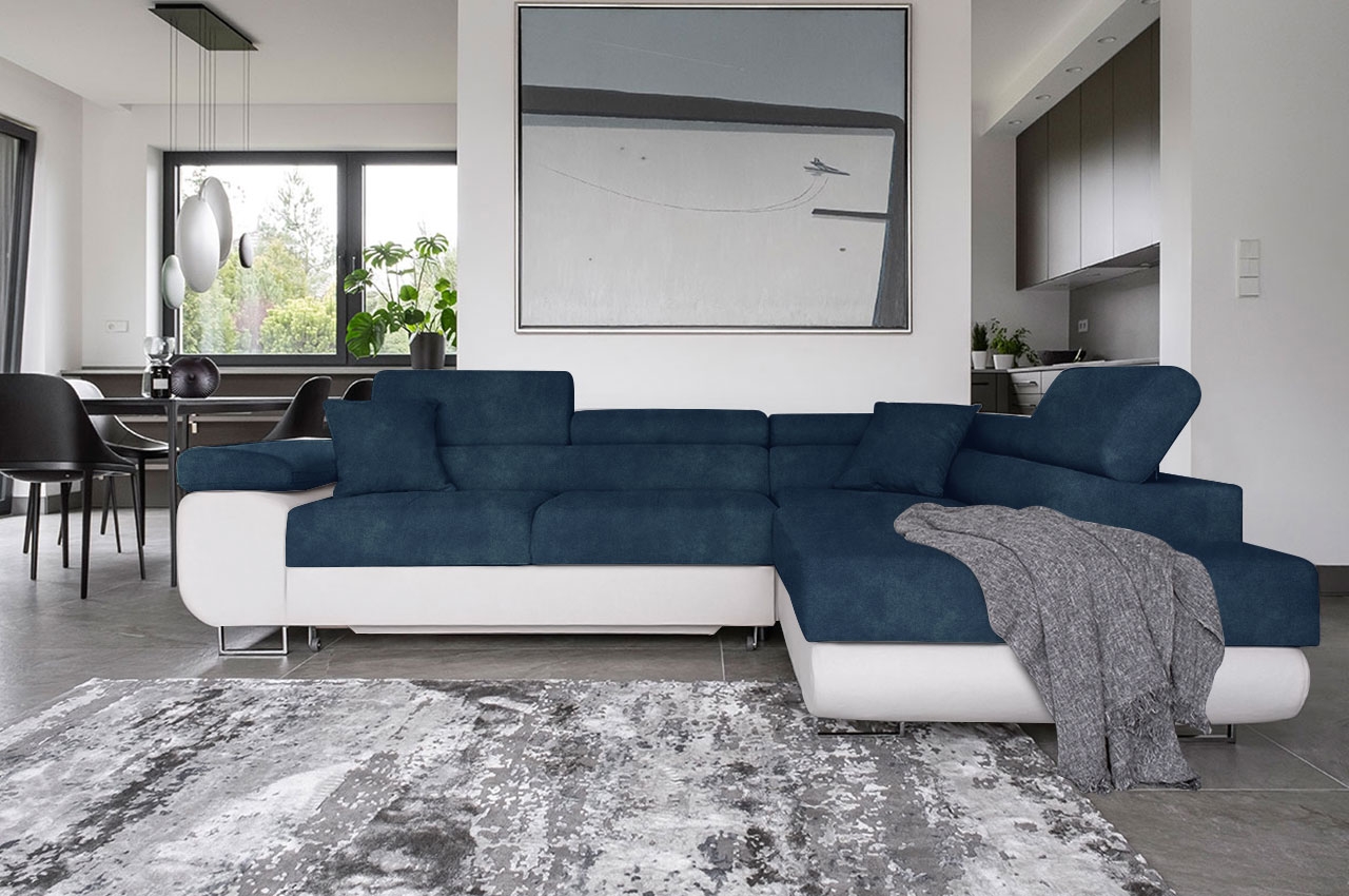 Das Ecksofa Tons vereint robuste Konstruktion mit ansprechenden Details, die seinem Design Raffinesse verleihen. Die leicht abgerundeten Seitenteile und die breite Armlehne verleihen ihm eine moderne Ästhetik, während die hohen, verchromten Metallfüße in Hochglanz das Gesamtbild elegant abrunden. Die dezenten Steppungen und Nähte auf den Sitzflächen sowie die bequemen Kopfstützen sorgen für zusätzlichen Komfort und einen Hauch von Luxus. Besonders praktisch sind die drei verstellbaren Kopfstützen, die es ermöglichen, das Sofa individuell an die Bedürfnisse und Vorlieben anzupassen und den Erholungskomfort erheblich verbessern. Mit seiner Schlaffunktion bietet das Ecksofa Tons auch eine praktische Lösung für Übernachtungsgäste, während der integrierte Bettkasten zusätzlichen Stauraum für Bettwäsche oder andere Utensilien bietet. Entdecken Sie das Ecksofa Tons und verwandeln Sie Ihr Wohnzimmer in eine stilvolle und komfortable Oase der Entspannung.