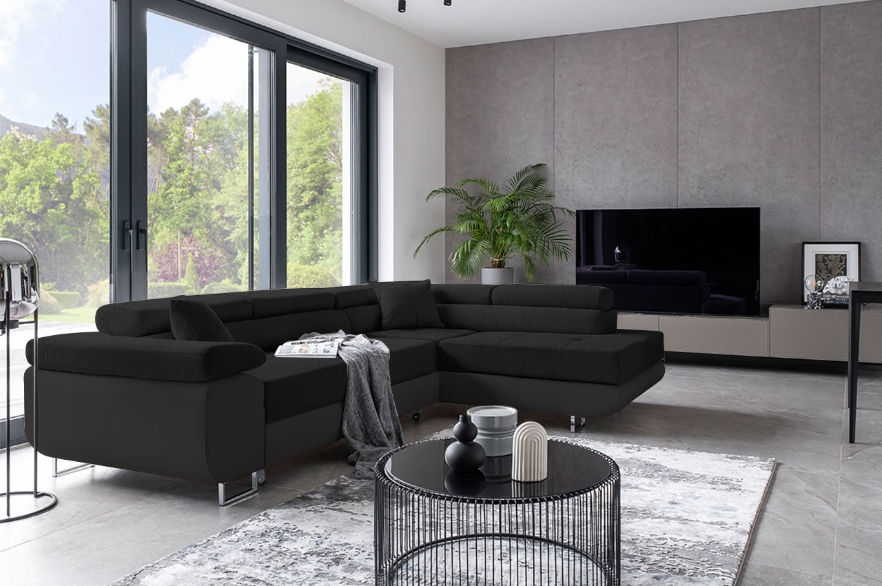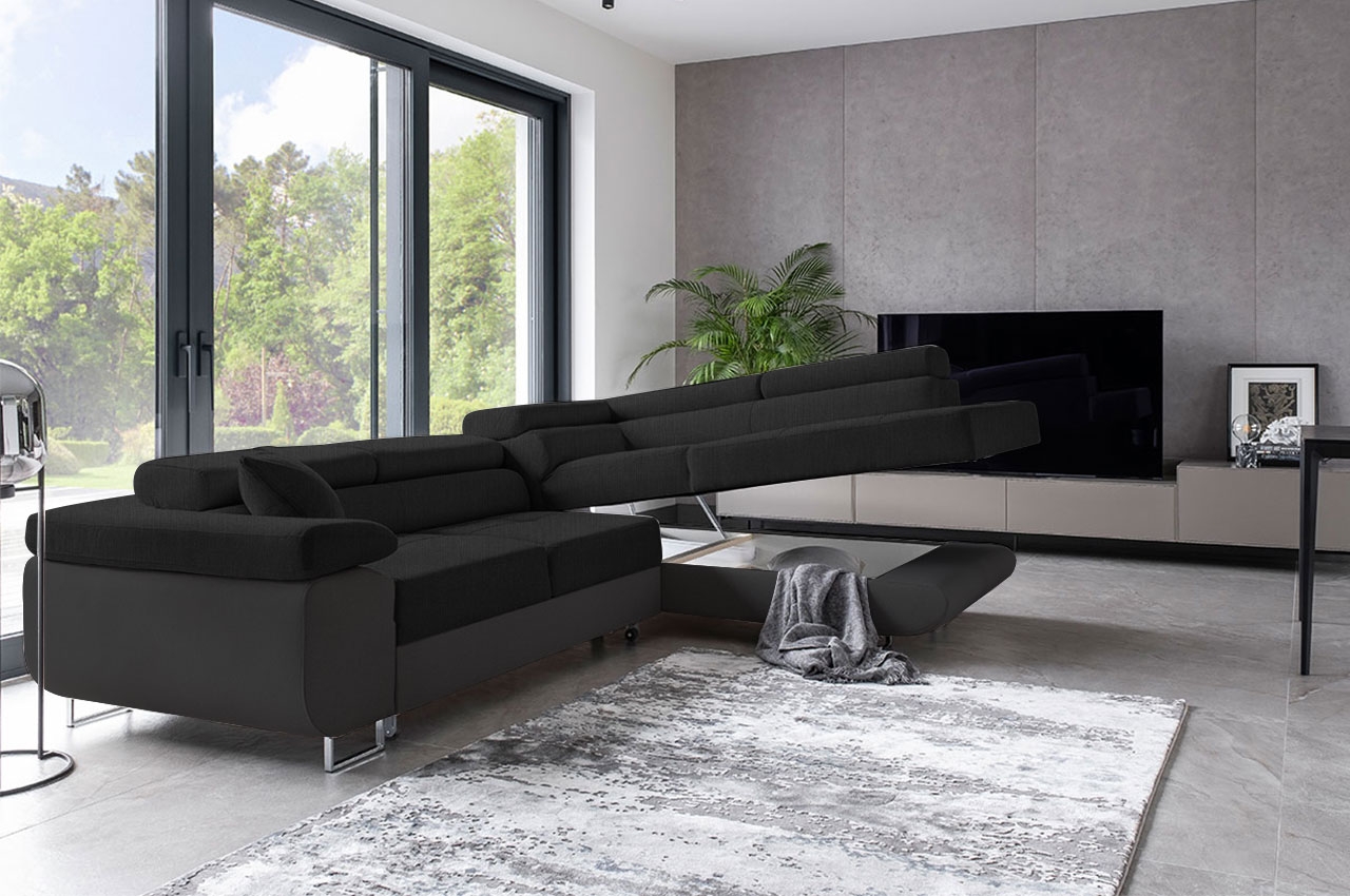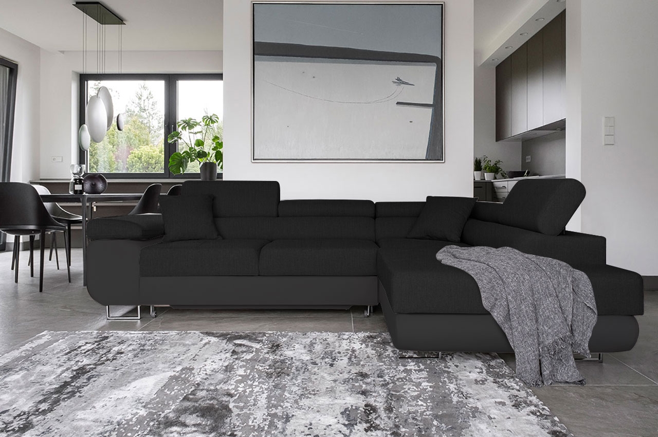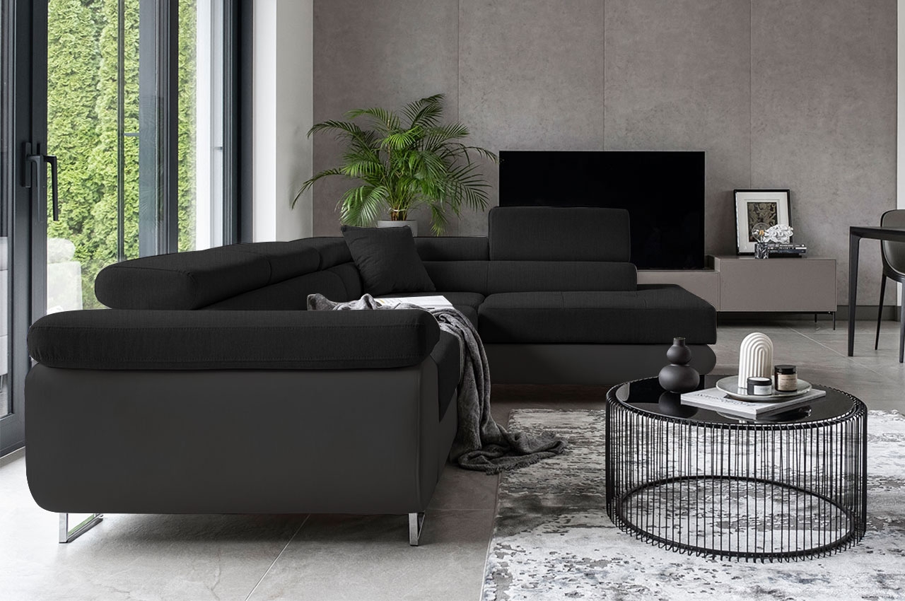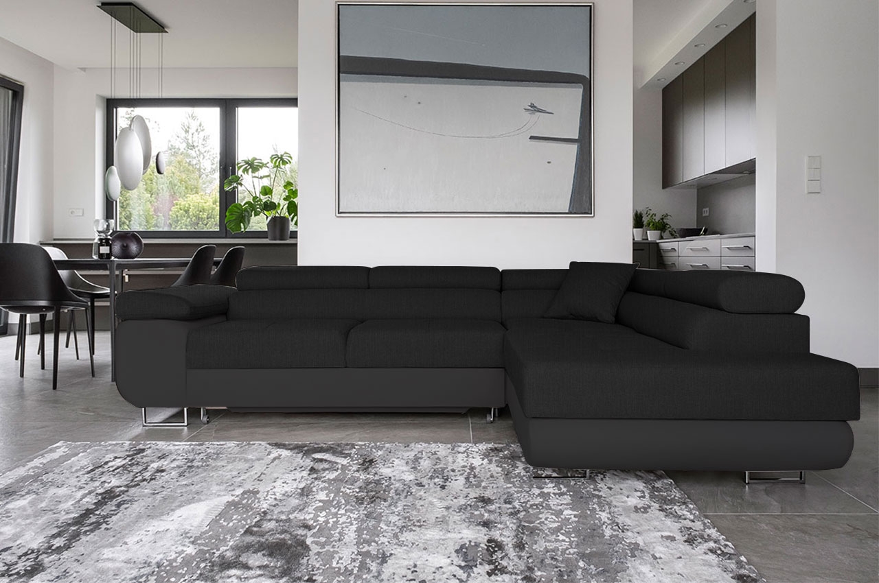 Das Ecksofa Tons vereint robuste Konstruktion mit ansprechenden Details, die seinem Design Raffinesse verleihen. Die leicht abgerundeten Seitenteile und die breite Armlehne verleihen ihm eine moderne Ästhetik, während die hohen, verchromten Metallfüße in Hochglanz das Gesamtbild elegant abrunden. Die dezenten Steppungen und Nähte auf den Sitzflächen sowie die bequemen Kopfstützen sorgen für zusätzlichen Komfort und einen Hauch von Luxus. Besonders praktisch sind die drei verstellbaren Kopfstützen, die es ermöglichen, das Sofa individuell an die Bedürfnisse und Vorlieben anzupassen und den Erholungskomfort erheblich verbessern. Mit seiner Schlaffunktion bietet das Ecksofa Tons auch eine praktische Lösung für Übernachtungsgäste, während der integrierte Bettkasten zusätzlichen Stauraum für Bettwäsche oder andere Utensilien bietet. Entdecken Sie das Ecksofa Tons und verwandeln Sie Ihr Wohnzimmer in eine stilvolle und komfortable Oase der Entspannung.