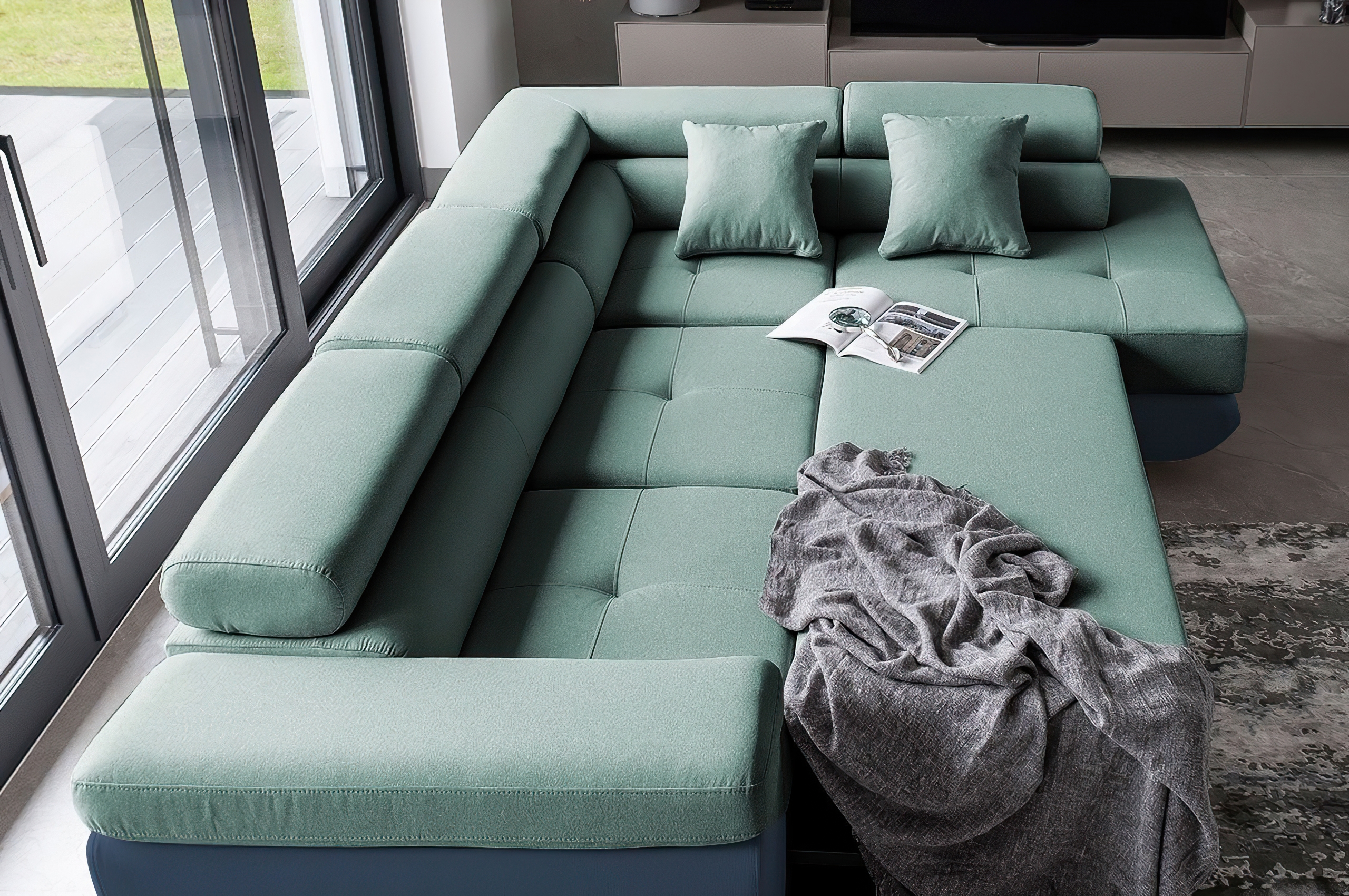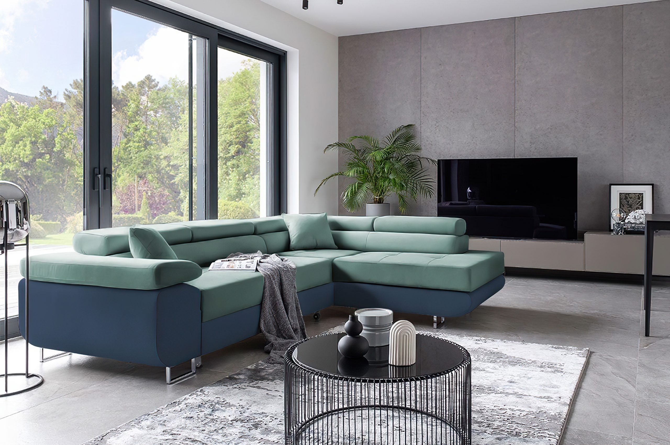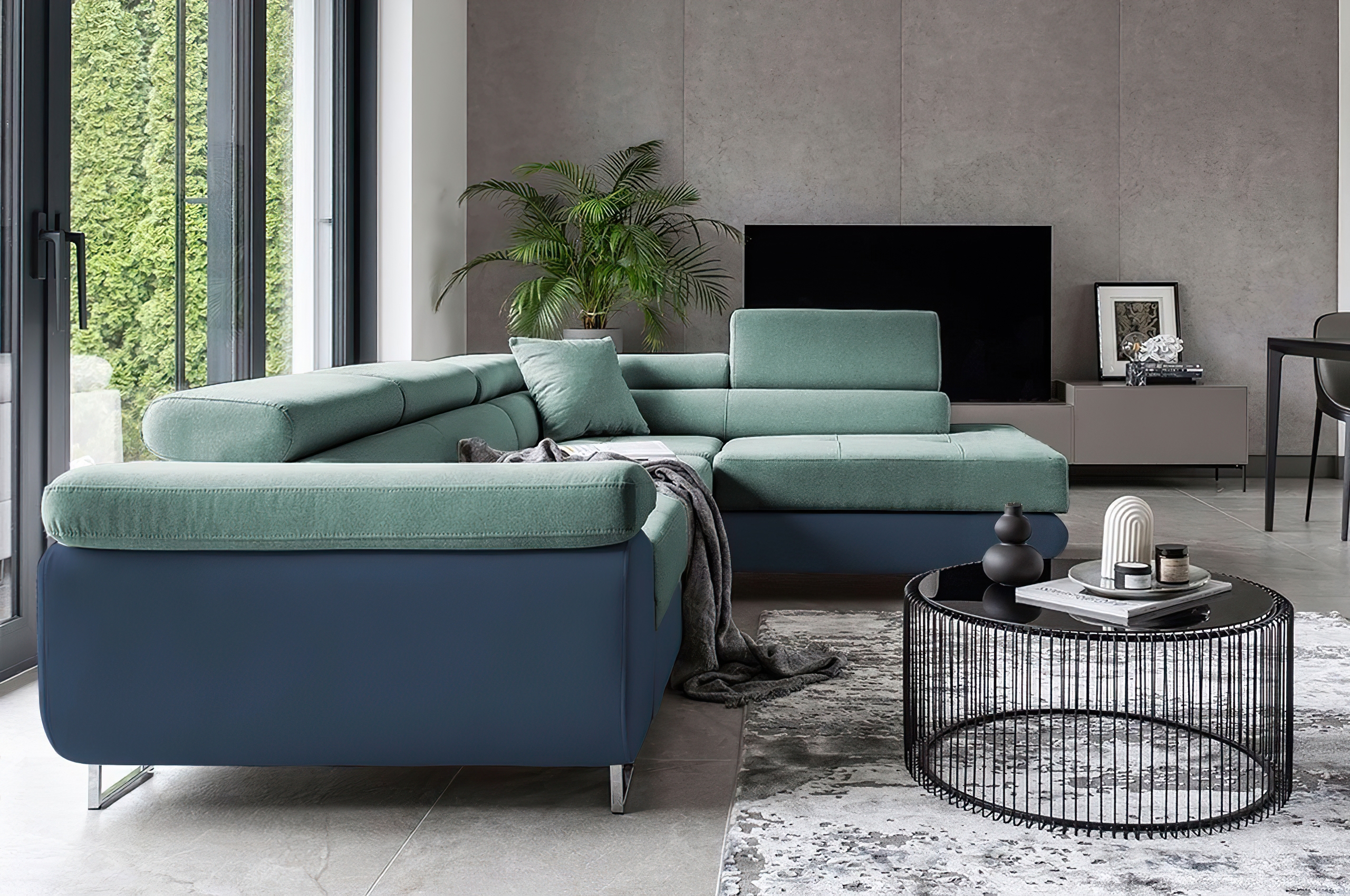 Das Ecksofa Tons vereint robuste Konstruktion mit ansprechenden Details, die seinem Design Raffinesse verleihen. Die leicht abgerundeten Seitenteile und die breite Armlehne verleihen ihm eine moderne Ästhetik, während die hohen, verchromten Metallfüße in Hochglanz das Gesamtbild elegant abrunden. Die dezenten Steppungen und Nähte auf den Sitzflächen sowie die bequemen Kopfstützen sorgen für zusätzlichen Komfort und einen Hauch von Luxus. Besonders praktisch sind die drei verstellbaren Kopfstützen, die es ermöglichen, das Sofa individuell an die Bedürfnisse und Vorlieben anzupassen und den Erholungskomfort erheblich verbessern. Mit seiner Schlaffunktion bietet das Ecksofa Tons auch eine praktische Lösung für Übernachtungsgäste, während der integrierte Bettkasten zusätzlichen Stauraum für Bettwäsche oder andere Utensilien bietet. Entdecken Sie das Ecksofa Tons und verwandeln Sie Ihr Wohnzimmer in eine stilvolle und komfortable Oase der Entspannung.