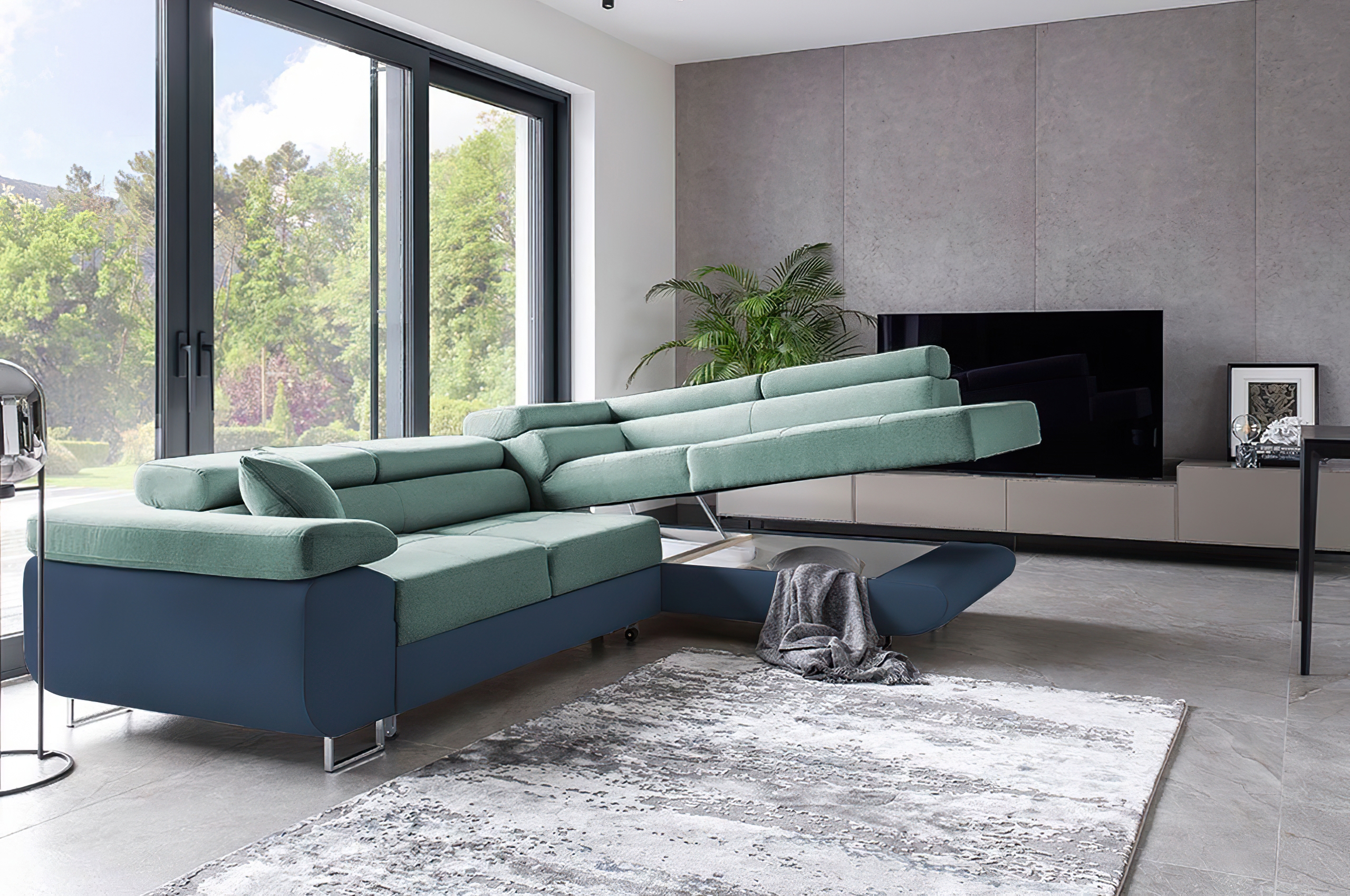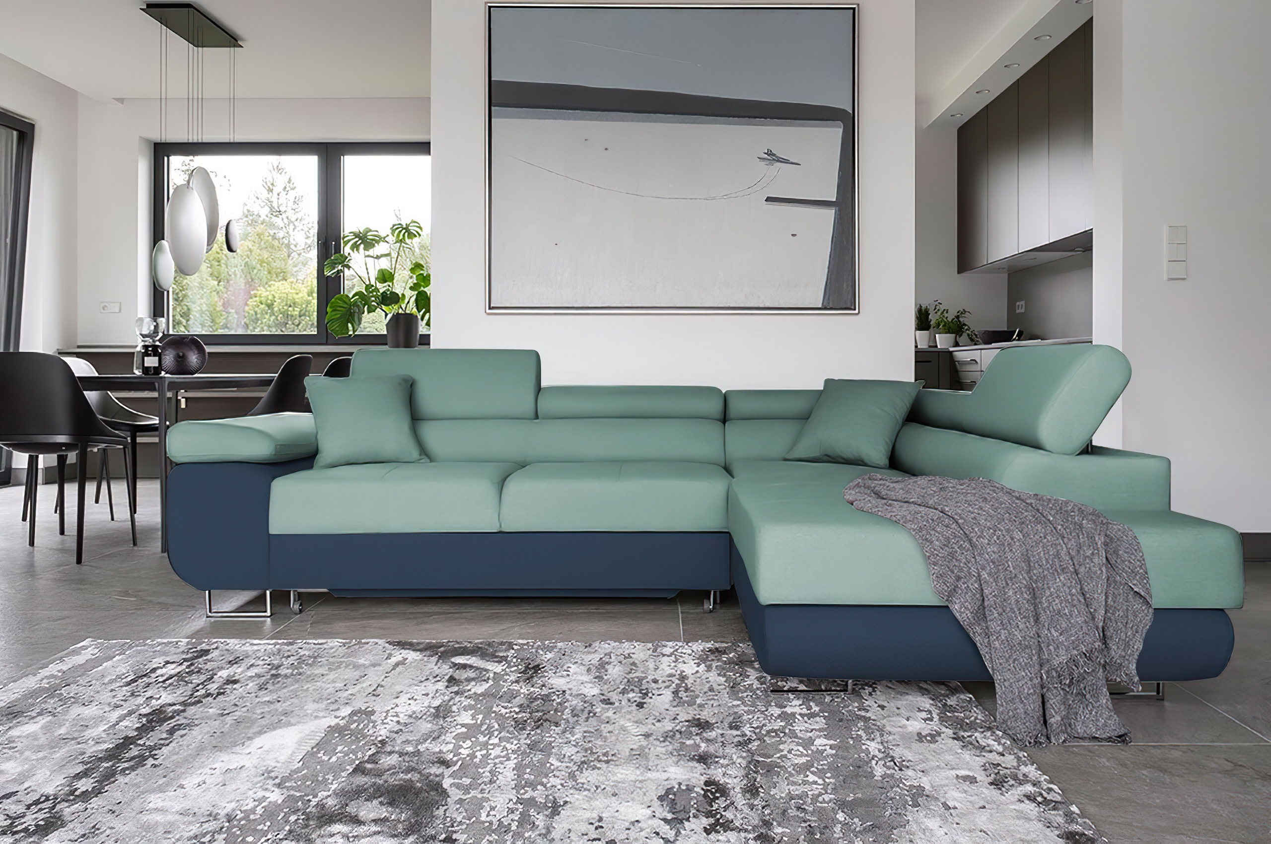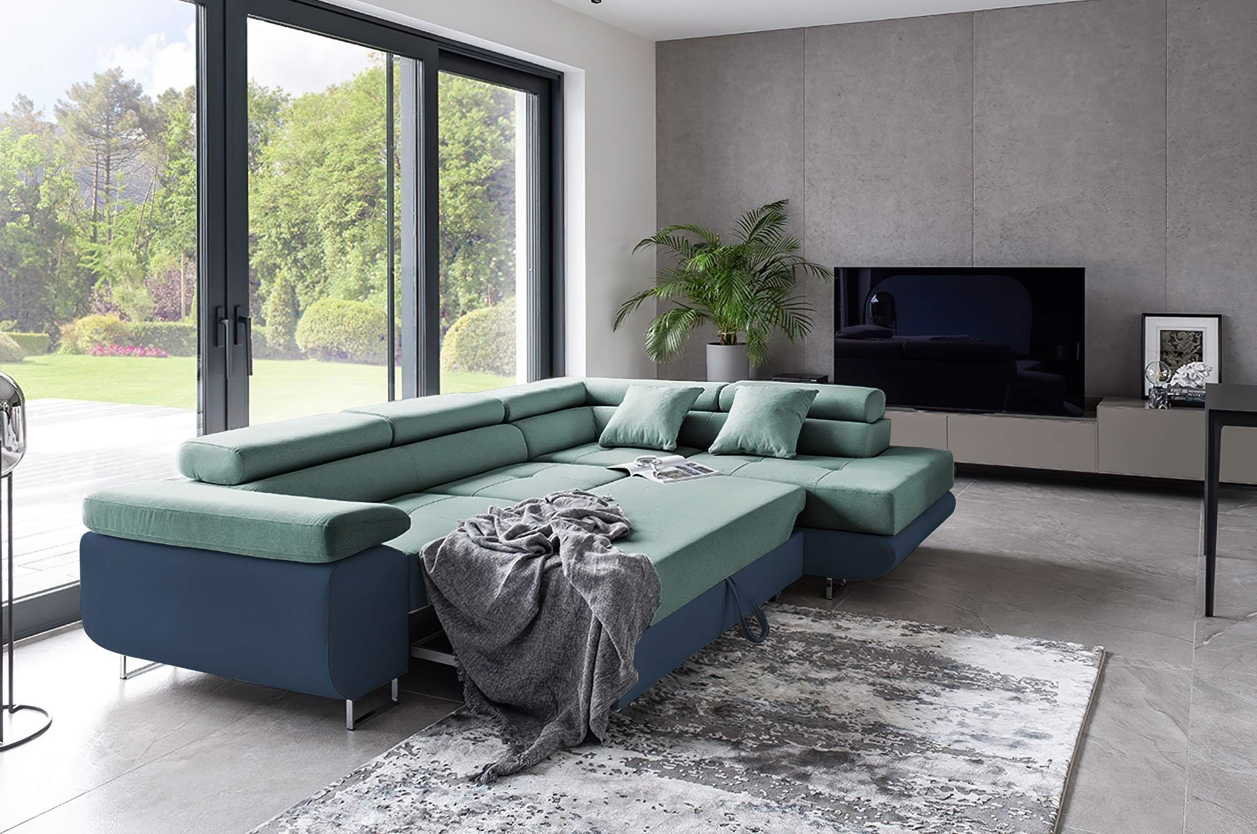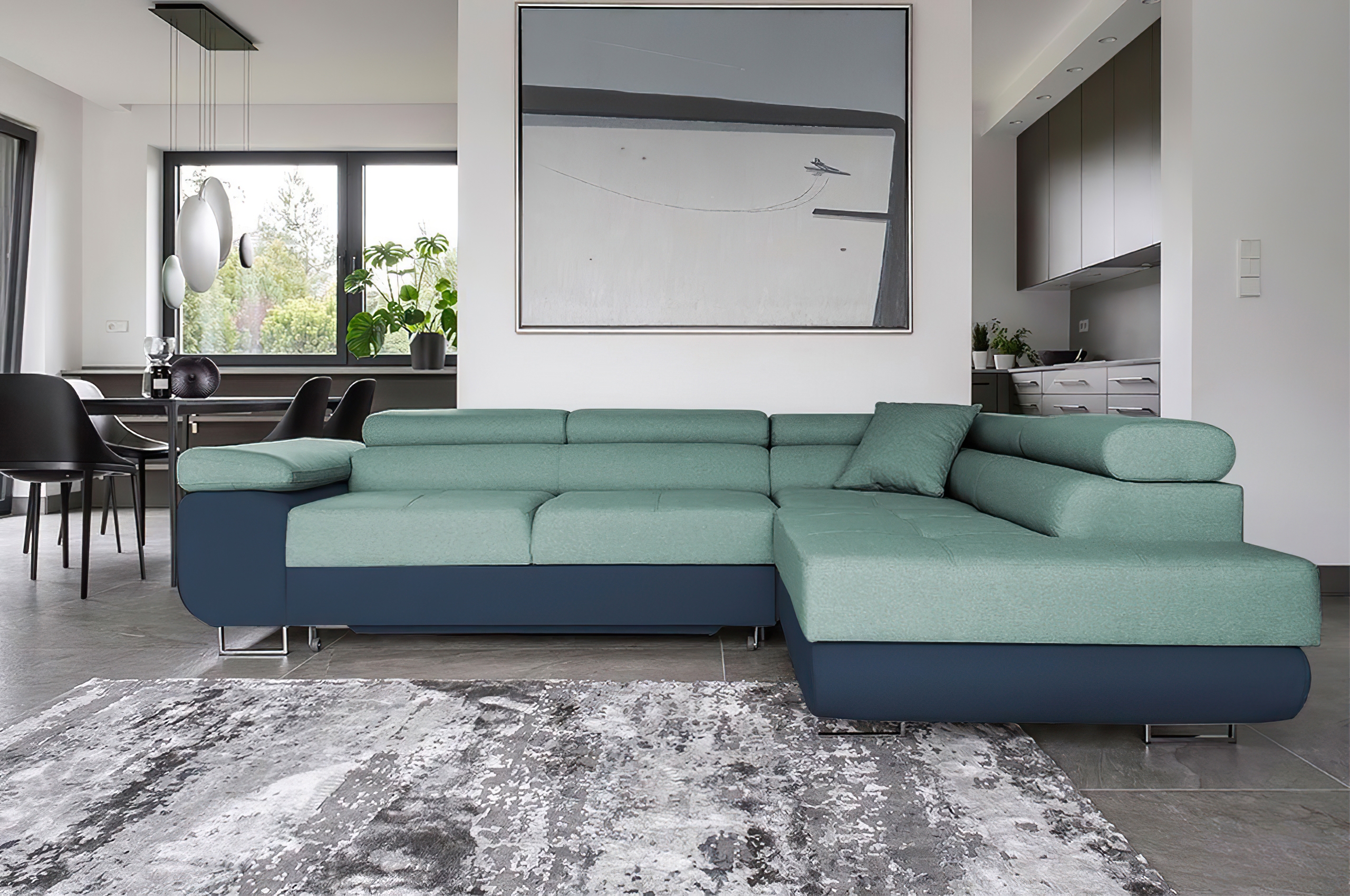 Das Ecksofa Tons vereint robuste Konstruktion mit ansprechenden Details, die seinem Design Raffinesse verleihen. Die leicht abgerundeten Seitenteile und die breite Armlehne verleihen ihm eine moderne Ästhetik, während die hohen, verchromten Metallfüße in Hochglanz das Gesamtbild elegant abrunden. Die dezenten Steppungen und Nähte auf den Sitzflächen sowie die bequemen Kopfstützen sorgen für zusätzlichen Komfort und einen Hauch von Luxus. Besonders praktisch sind die drei verstellbaren Kopfstützen, die es ermöglichen, das Sofa individuell an die Bedürfnisse und Vorlieben anzupassen und den Erholungskomfort erheblich verbessern. Mit seiner Schlaffunktion bietet das Ecksofa Tons auch eine praktische Lösung für Übernachtungsgäste, während der integrierte Bettkasten zusätzlichen Stauraum für Bettwäsche oder andere Utensilien bietet. Entdecken Sie das Ecksofa Tons und verwandeln Sie Ihr Wohnzimmer in eine stilvolle und komfortable Oase der Entspannung.