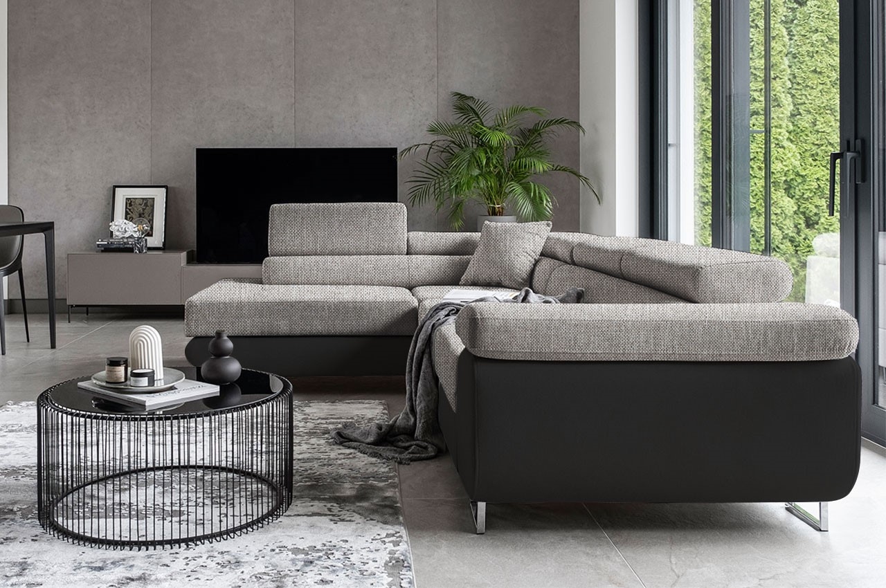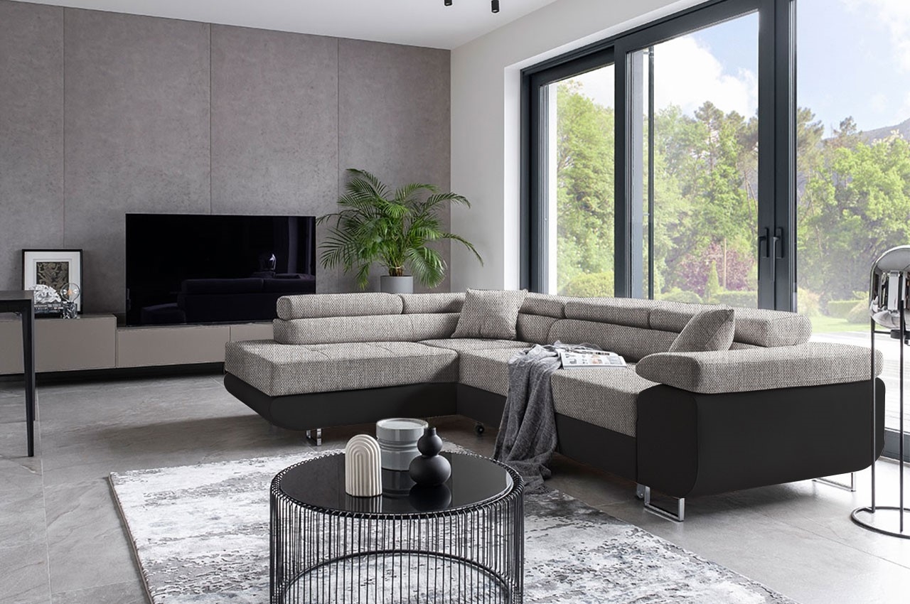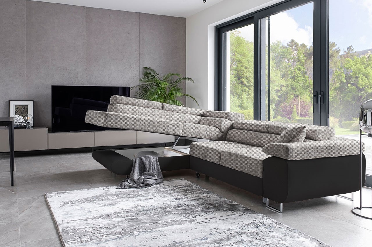 Das Ecksofa Tons vereint robuste Konstruktion mit ansprechenden Details, die seinem Design Raffinesse verleihen. Die leicht abgerundeten Seitenteile und die breite Armlehne verleihen ihm eine moderne Ästhetik, während die hohen, verchromten Metallfüße in Hochglanz das Gesamtbild elegant abrunden. Die dezenten Steppungen und Nähte auf den Sitzflächen sowie die bequemen Kopfstützen sorgen für zusätzlichen Komfort und einen Hauch von Luxus. Besonders praktisch sind die drei verstellbaren Kopfstützen, die es ermöglichen, das Sofa individuell an die Bedürfnisse und Vorlieben anzupassen und den Erholungskomfort erheblich verbessern. Mit seiner Schlaffunktion bietet das Ecksofa Tons auch eine praktische Lösung für Übernachtungsgäste, während der integrierte Bettkasten zusätzlichen Stauraum für Bettwäsche oder andere Utensilien bietet. Entdecken Sie das Ecksofa Tons und verwandeln Sie Ihr Wohnzimmer in eine stilvolle und komfortable Oase der Entspannung.