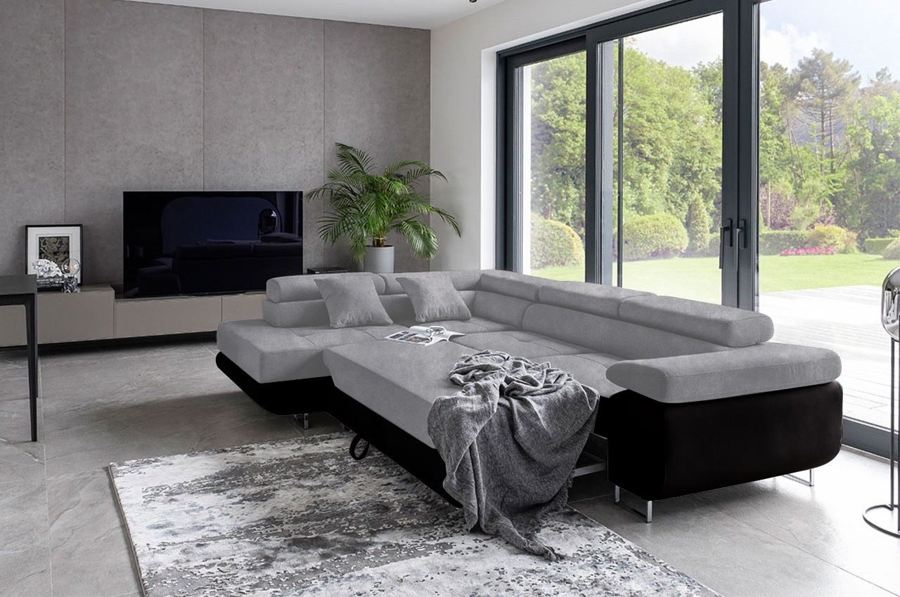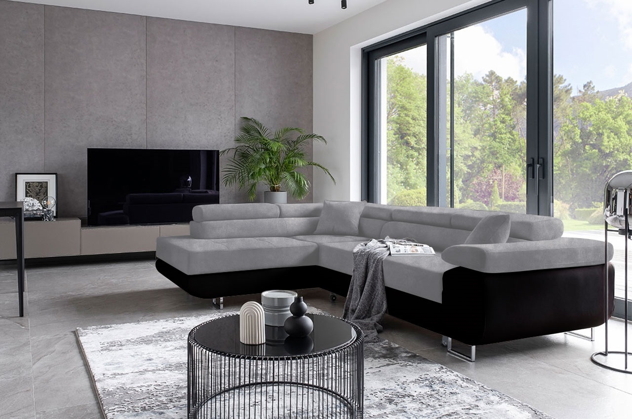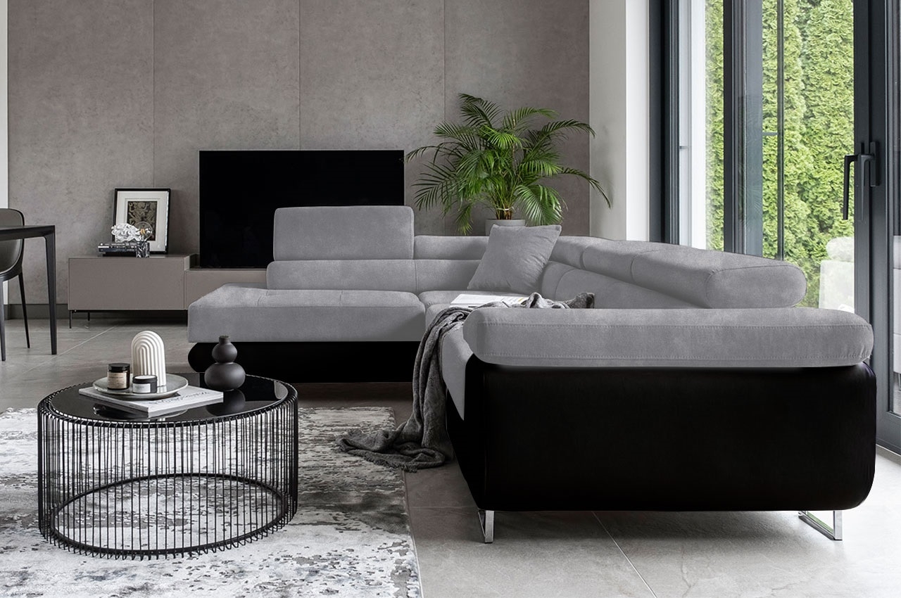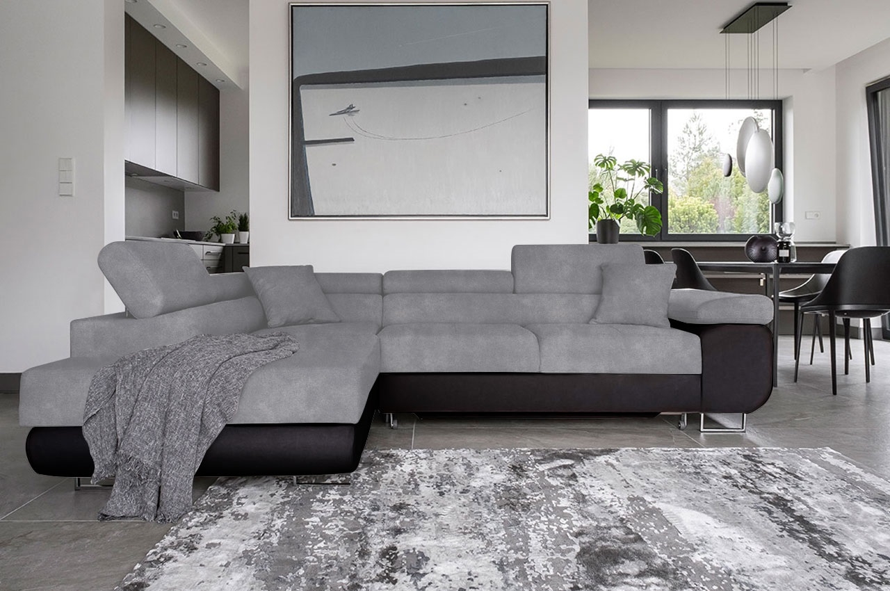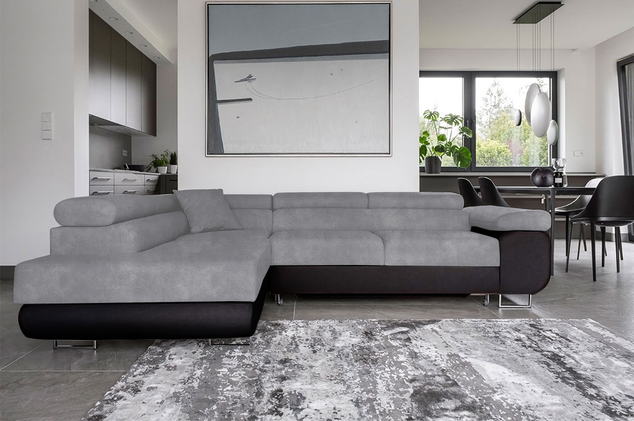 Das Ecksofa Tons vereint robuste Konstruktion mit ansprechenden Details, die seinem Design Raffinesse verleihen. Die leicht abgerundeten Seitenteile und die breite Armlehne verleihen ihm eine moderne Ästhetik, während die hohen, verchromten Metallfüße in Hochglanz das Gesamtbild elegant abrunden. Die dezenten Steppungen und Nähte auf den Sitzflächen sowie die bequemen Kopfstützen sorgen für zusätzlichen Komfort und einen Hauch von Luxus. Besonders praktisch sind die drei verstellbaren Kopfstützen, die es ermöglichen, das Sofa individuell an die Bedürfnisse und Vorlieben anzupassen und den Erholungskomfort erheblich verbessern. Mit seiner Schlaffunktion bietet das Ecksofa Tons auch eine praktische Lösung für Übernachtungsgäste, während der integrierte Bettkasten zusätzlichen Stauraum für Bettwäsche oder andere Utensilien bietet. Entdecken Sie das Ecksofa Tons und verwandeln Sie Ihr Wohnzimmer in eine stilvolle und komfortable Oase der Entspannung.