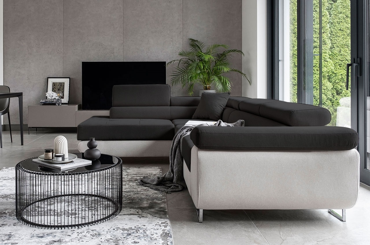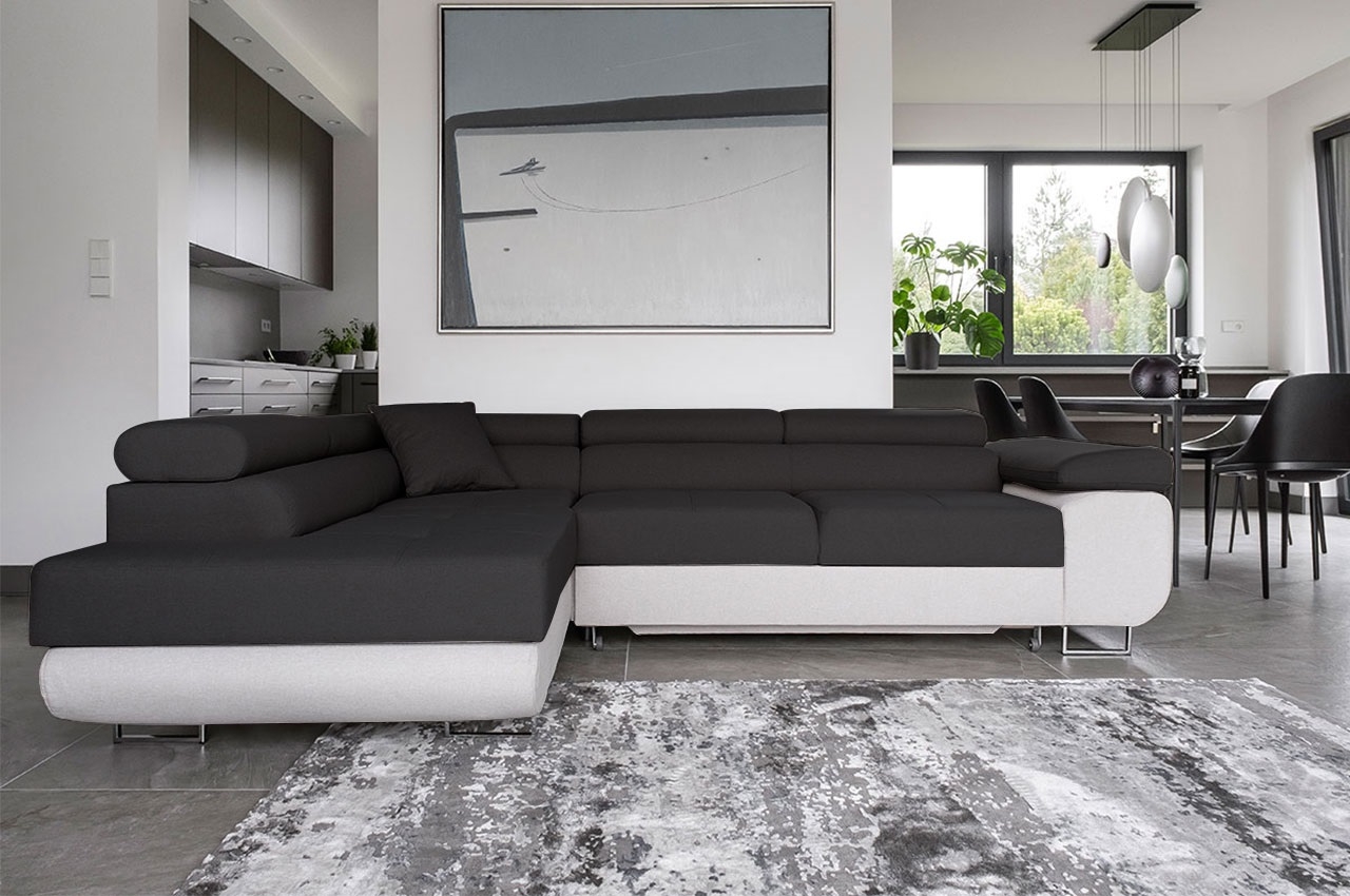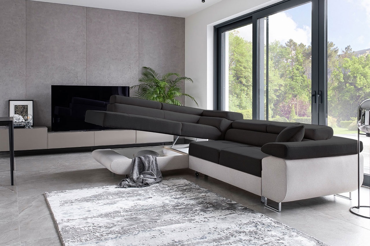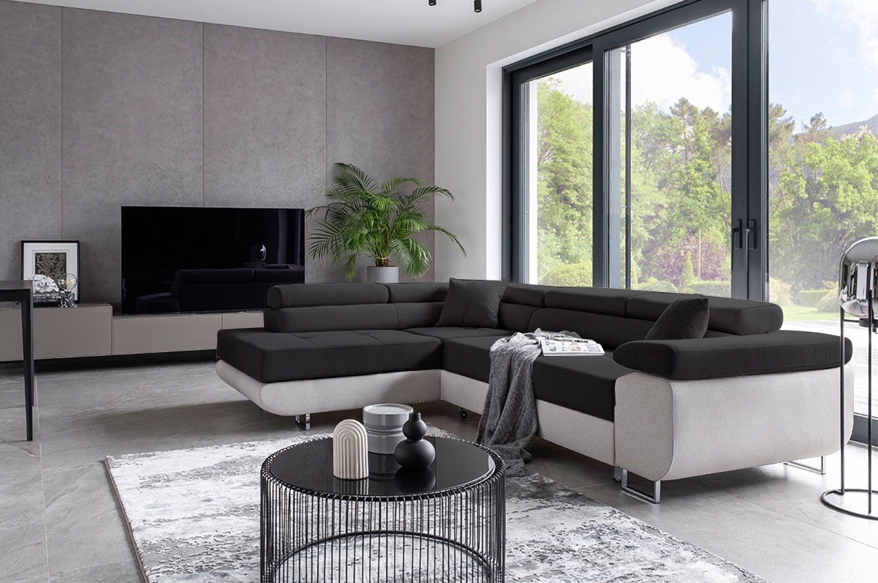 Das Ecksofa Tons vereint robuste Konstruktion mit ansprechenden Details, die seinem Design Raffinesse verleihen. Die leicht abgerundeten Seitenteile und die breite Armlehne verleihen ihm eine moderne Ästhetik, während die hohen, verchromten Metallfüße in Hochglanz das Gesamtbild elegant abrunden. Die dezenten Steppungen und Nähte auf den Sitzflächen sowie die bequemen Kopfstützen sorgen für zusätzlichen Komfort und einen Hauch von Luxus. Besonders praktisch sind die drei verstellbaren Kopfstützen, die es ermöglichen, das Sofa individuell an die Bedürfnisse und Vorlieben anzupassen und den Erholungskomfort erheblich verbessern. Mit seiner Schlaffunktion bietet das Ecksofa Tons auch eine praktische Lösung für Übernachtungsgäste, während der integrierte Bettkasten zusätzlichen Stauraum für Bettwäsche oder andere Utensilien bietet. Entdecken Sie das Ecksofa Tons und verwandeln Sie Ihr Wohnzimmer in eine stilvolle und komfortable Oase der Entspannung.