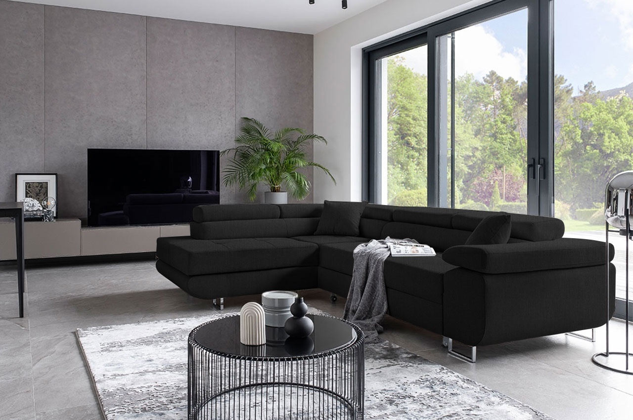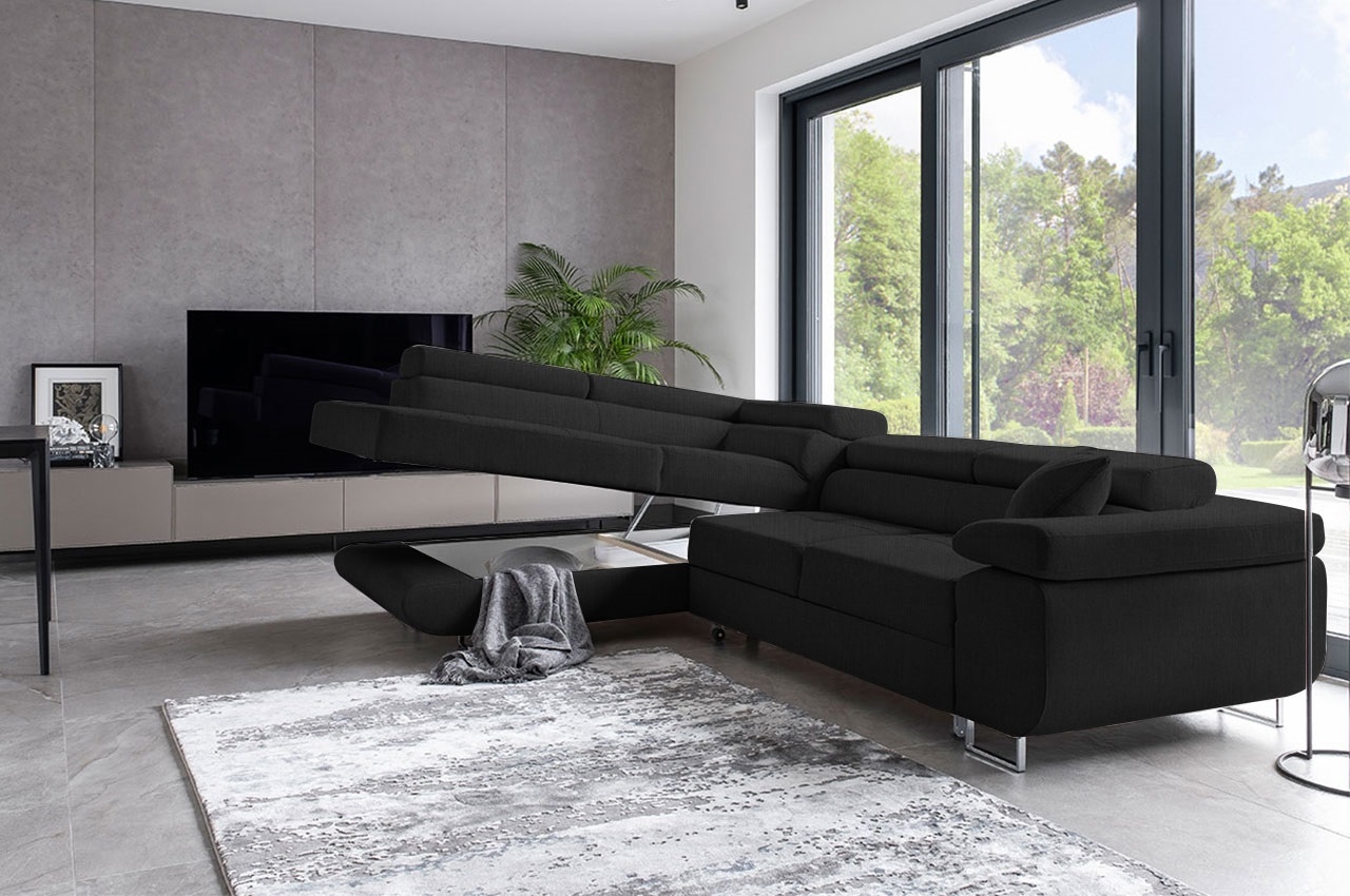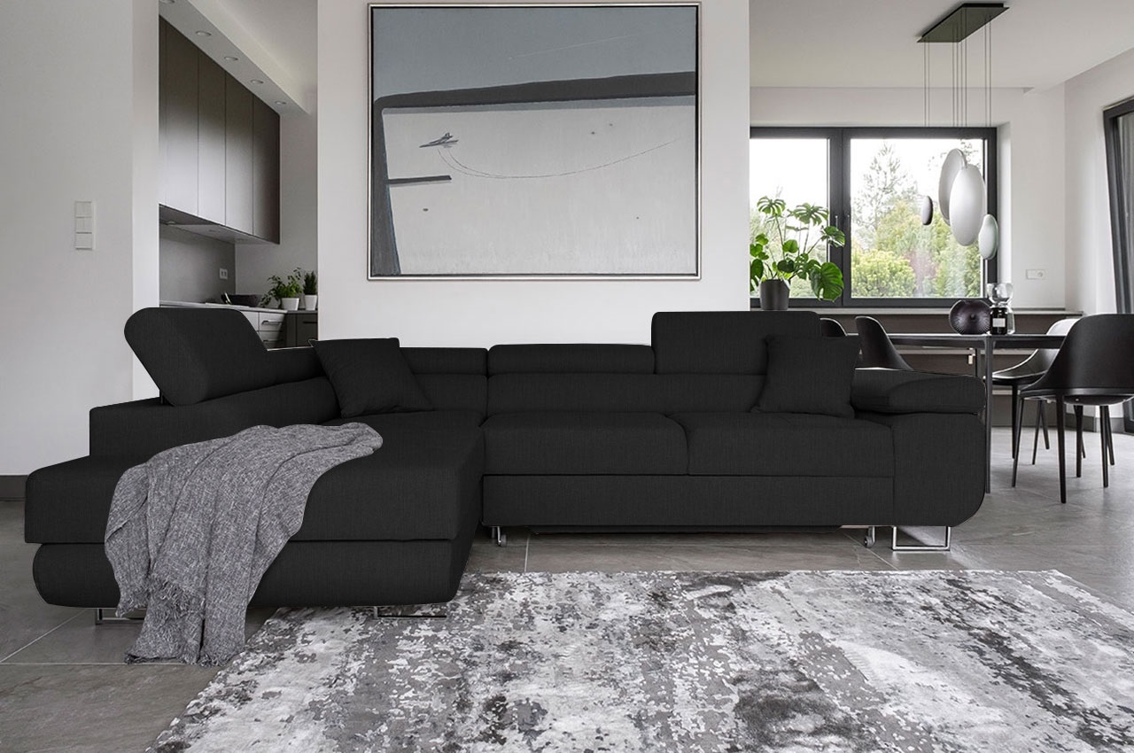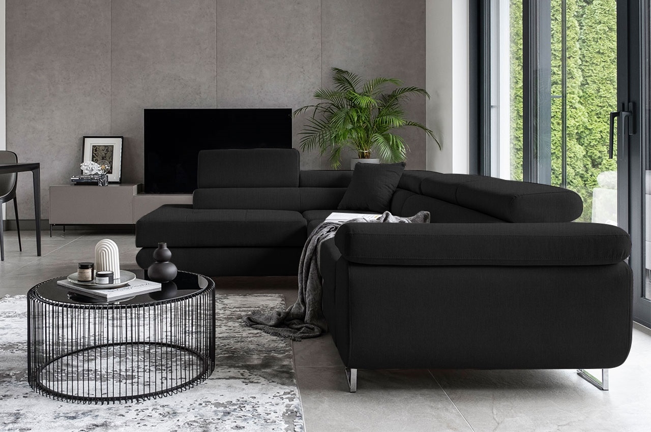 Das Ecksofa Tons vereint robuste Konstruktion mit ansprechenden Details, die seinem Design Raffinesse verleihen. Die leicht abgerundeten Seitenteile und die breite Armlehne verleihen ihm eine moderne Ästhetik, während die hohen, verchromten Metallfüße in Hochglanz das Gesamtbild elegant abrunden. Die dezenten Steppungen und Nähte auf den Sitzflächen sowie die bequemen Kopfstützen sorgen für zusätzlichen Komfort und einen Hauch von Luxus. Besonders praktisch sind die drei verstellbaren Kopfstützen, die es ermöglichen, das Sofa individuell an die Bedürfnisse und Vorlieben anzupassen und den Erholungskomfort erheblich verbessern. Mit seiner Schlaffunktion bietet das Ecksofa Tons auch eine praktische Lösung für Übernachtungsgäste, während der integrierte Bettkasten zusätzlichen Stauraum für Bettwäsche oder andere Utensilien bietet. Entdecken Sie das Ecksofa Tons und verwandeln Sie Ihr Wohnzimmer in eine stilvolle und komfortable Oase der Entspannung.