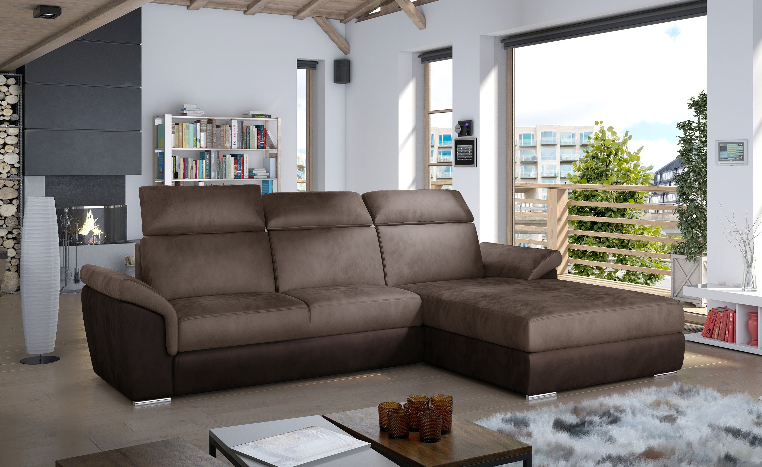 Das moderne Ecksofa mit Schlaffunktion und Bettkasten vereint Funktionalität und Stil. Verstellbare Kopf- und Armteile bieten individuellen Komfort, während metallische Füße Stabilität gewährleisten. Die ausprofilierten Rückenlehnen und geneigten Armlehnen sorgen für eine ergonomische Sitzposition. Die Sitze kombinieren Wellenfedern und T30-Schaumstoff für optimalen Sitzkomfort. Mit verstellbaren Kopfstützen können Sie Ihre Liegeposition anpassen. Erhältlich in verschiedenen Farben und Stoffen, passt dieses Ecksofa perfekt zu Ihrem Wohnstil.