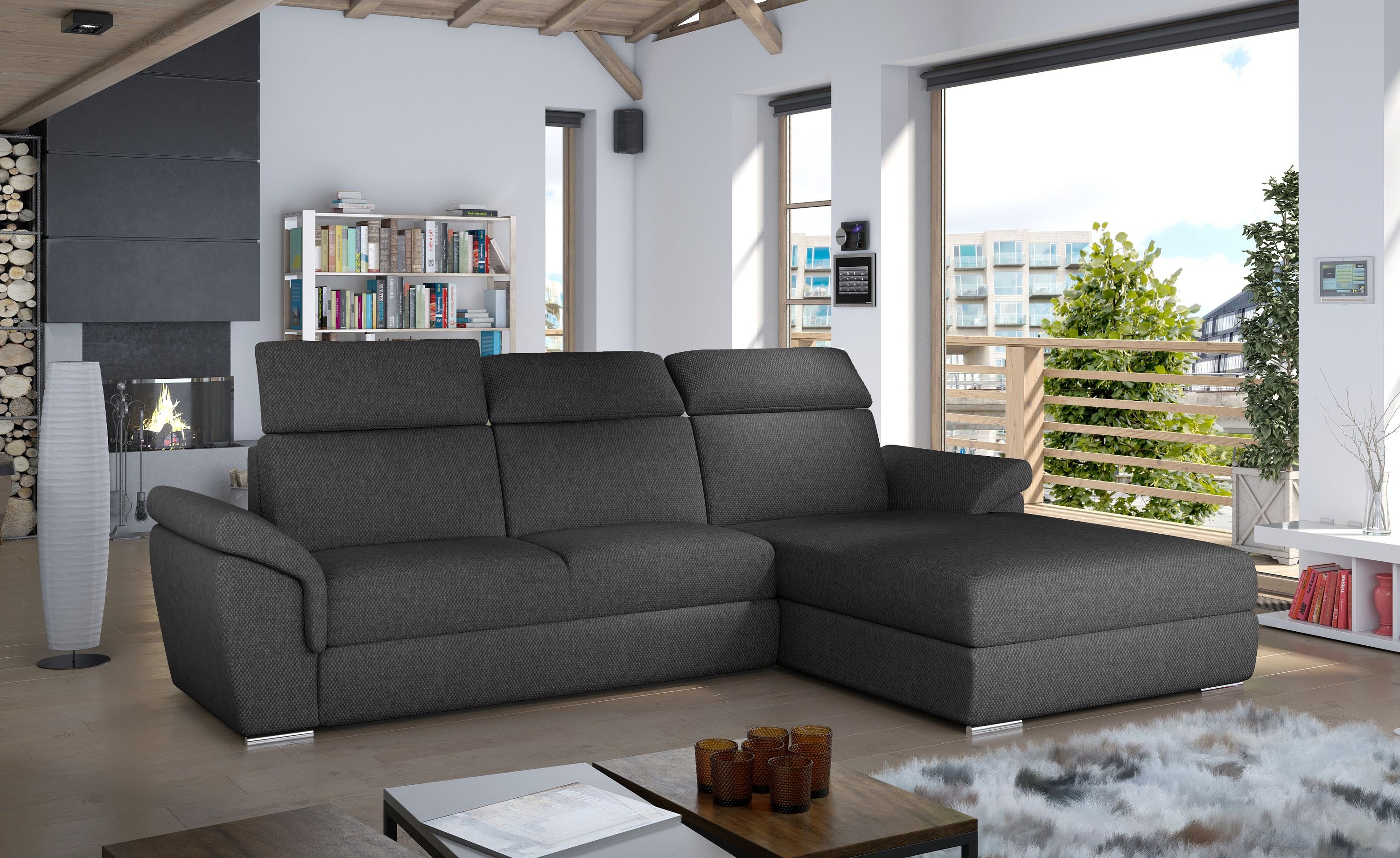 Das moderne Ecksofa mit Schlaffunktion und Bettkasten vereint Funktionalität und Stil. Verstellbare Kopf- und Armteile bieten individuellen Komfort, während metallische Füße Stabilität gewährleisten. Die ausprofilierten Rückenlehnen und geneigten Armlehnen sorgen für eine ergonomische Sitzposition. Die Sitze kombinieren Wellenfedern und T30-Schaumstoff für optimalen Sitzkomfort. Mit verstellbaren Kopfstützen können Sie Ihre Liegeposition anpassen. Erhältlich in verschiedenen Farben und Stoffen, passt dieses Ecksofa perfekt zu Ihrem Wohnstil.