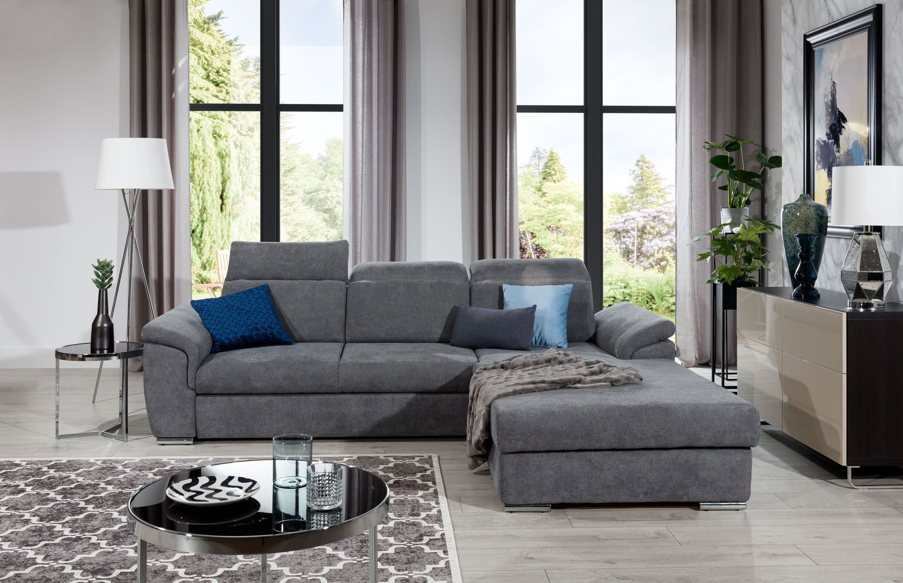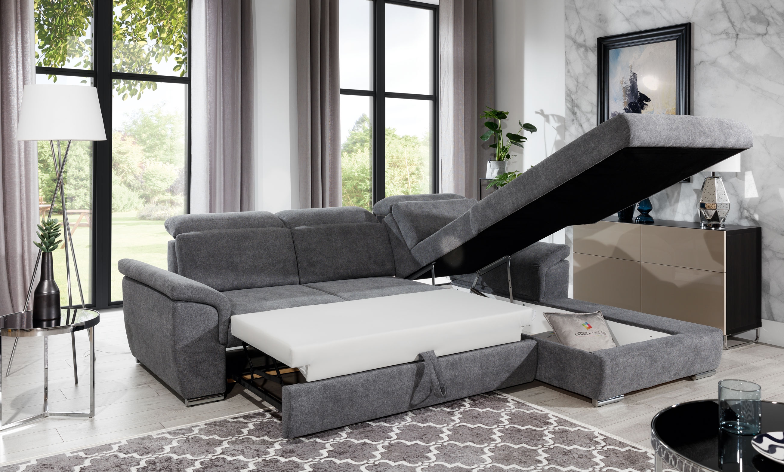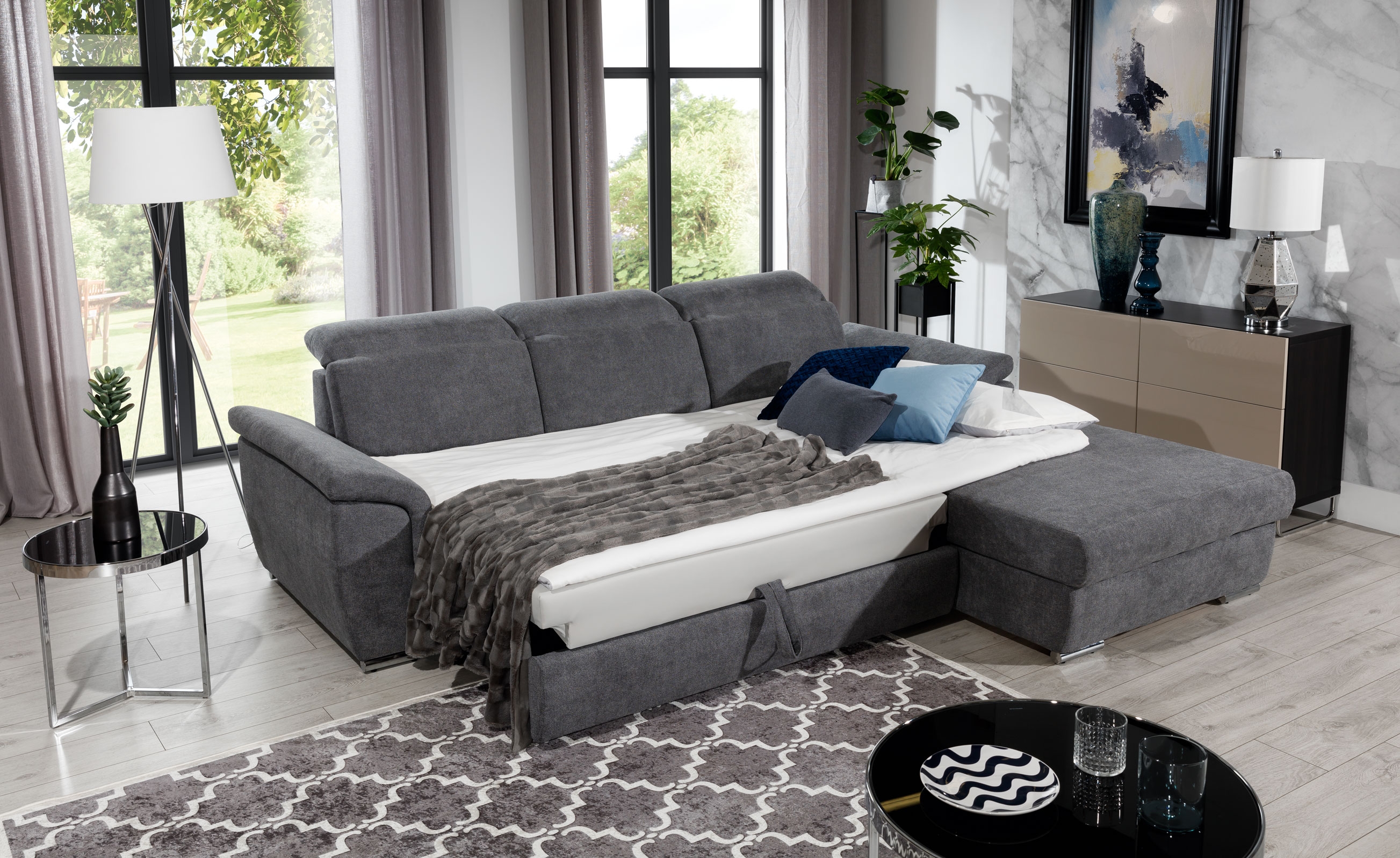 Das moderne Ecksofa mit Schlaffunktion und Bettkasten vereint Funktionalität und Stil. Verstellbare Kopf- und Armteile bieten individuellen Komfort, während metallische Füße Stabilität gewährleisten. Die ausprofilierten Rückenlehnen und geneigten Armlehnen sorgen für eine ergonomische Sitzposition. Die Sitze kombinieren Wellenfedern und T30-Schaumstoff für optimalen Sitzkomfort. Mit verstellbaren Kopfstützen können Sie Ihre Liegeposition anpassen. Erhältlich in verschiedenen Farben und Stoffen, passt dieses Ecksofa perfekt zu Ihrem Wohnstil.
