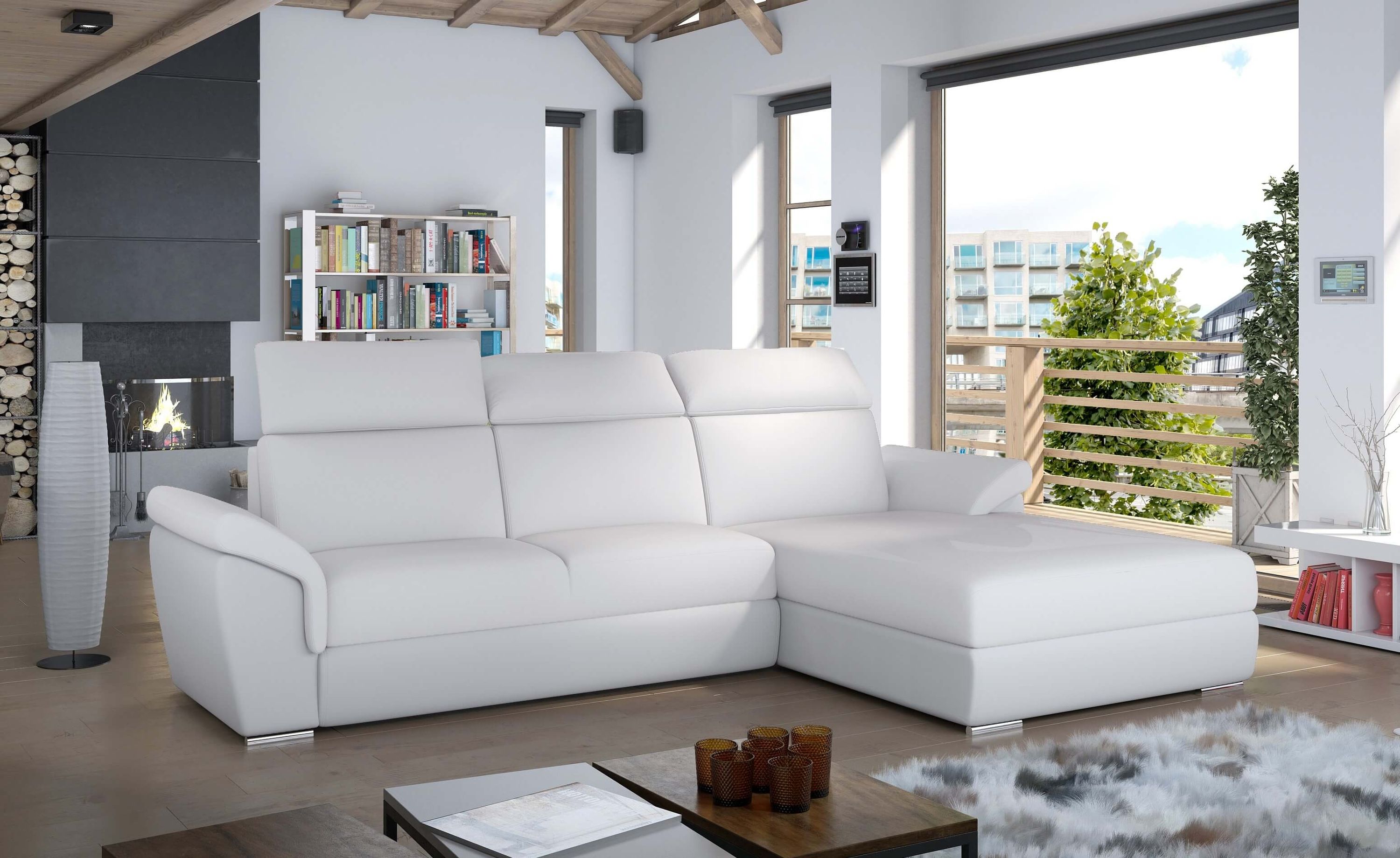 Das moderne Ecksofa mit Schlaffunktion und Bettkasten vereint Funktionalität und Stil. Verstellbare Kopf- und Armteile bieten individuellen Komfort, während metallische Füße Stabilität gewährleisten. Die ausprofilierten Rückenlehnen und geneigten Armlehnen sorgen für eine ergonomische Sitzposition. Die Sitze kombinieren Wellenfedern und T30-Schaumstoff für optimalen Sitzkomfort. Mit verstellbaren Kopfstützen können Sie Ihre Liegeposition anpassen. Erhältlich in verschiedenen Farben und Stoffen, passt dieses Ecksofa perfekt zu Ihrem Wohnstil.