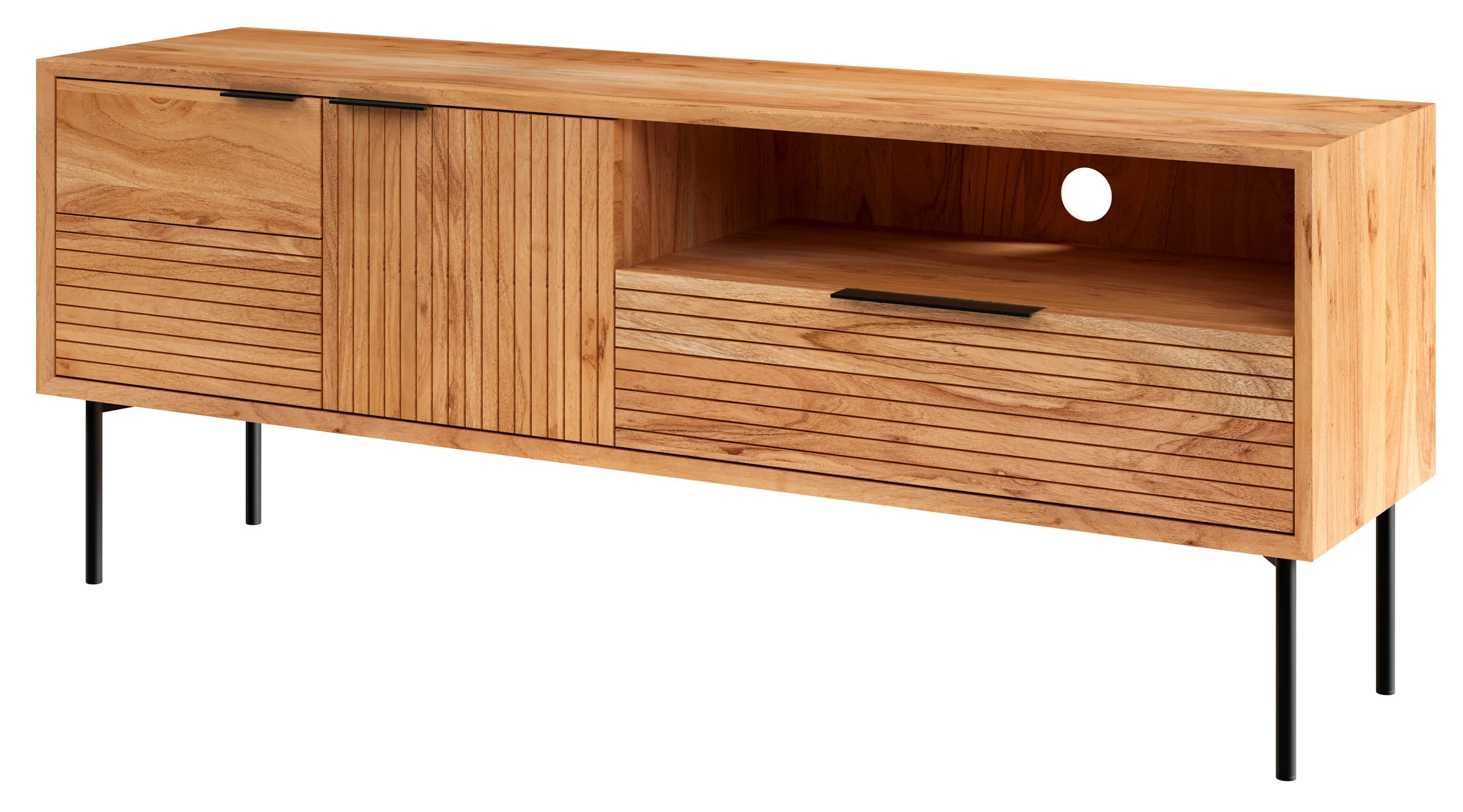 Dieses charmante Lowboard aus naturfarben gewachstem Akazienholz ist eine stilvolle Ergänzung für Ihr Zuhause. Mit seinen Maßen von ca. 155 x 63 x 42 cm bietet es genügend Stauraum für Ihre Multimedia-Geräte und andere Accessoires. Ausgestattet mit 2 Türen, 1 Schublade und 1 offenen Nische, ist es äußerst funktional. Die schwarz lackierten Metallgriffe und die pulverbeschichteten Metallfüße verleihen dem Möbelstück einen modernen Touch, der perfekt zu verschiedenen Einrichtungsstilen passt.