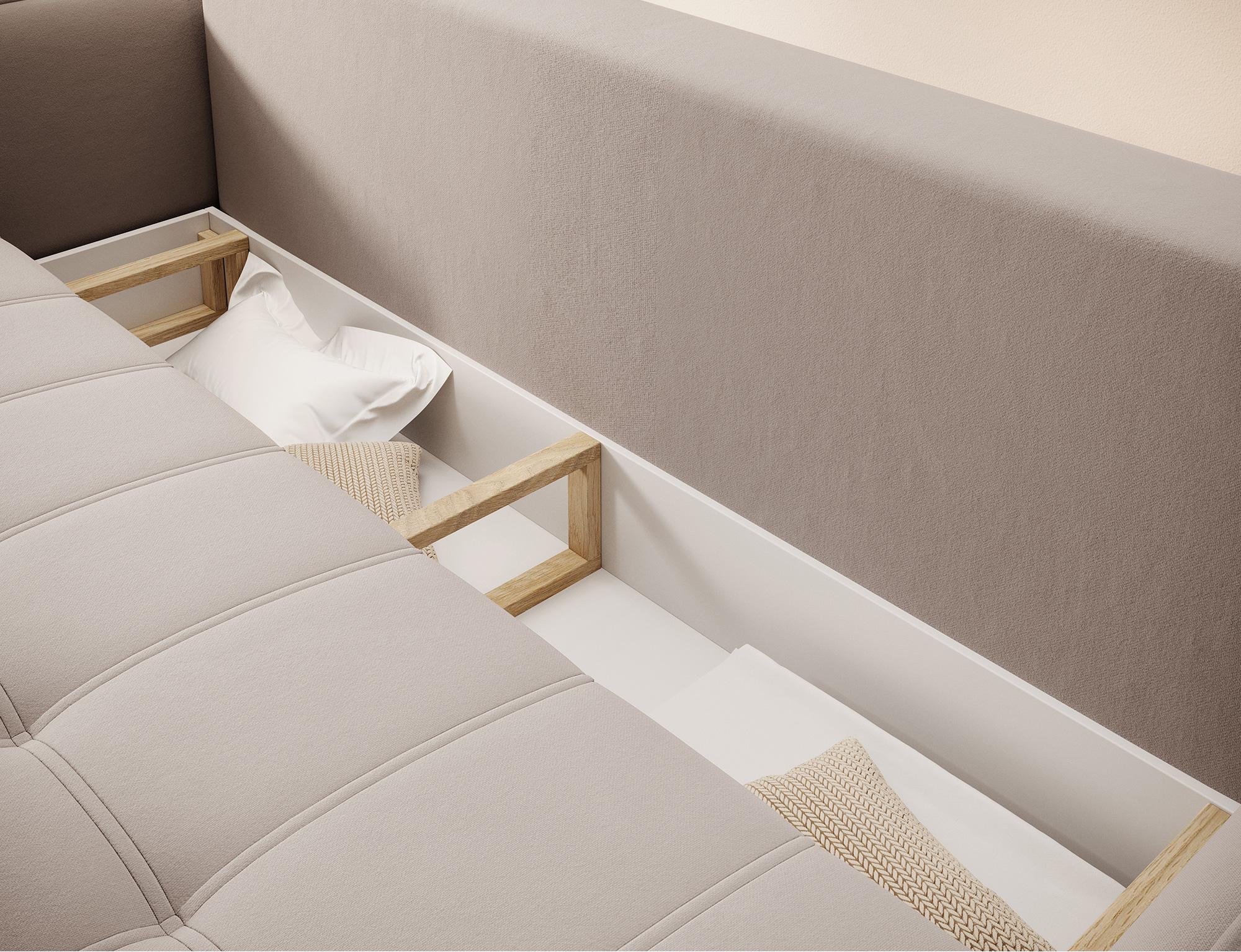 Dank der integrierten Schlaffunktion (Liegefläche 200×140 cm) mit DL-Ausziehmechanismus wird Wilson im Handumdrehen zu einem komfortablen Gästebett. Zusätzlich bietet der großzügige Bettkasten (198×60×19 cm) Platz für Decken, Bettwäsche oder Kissen.