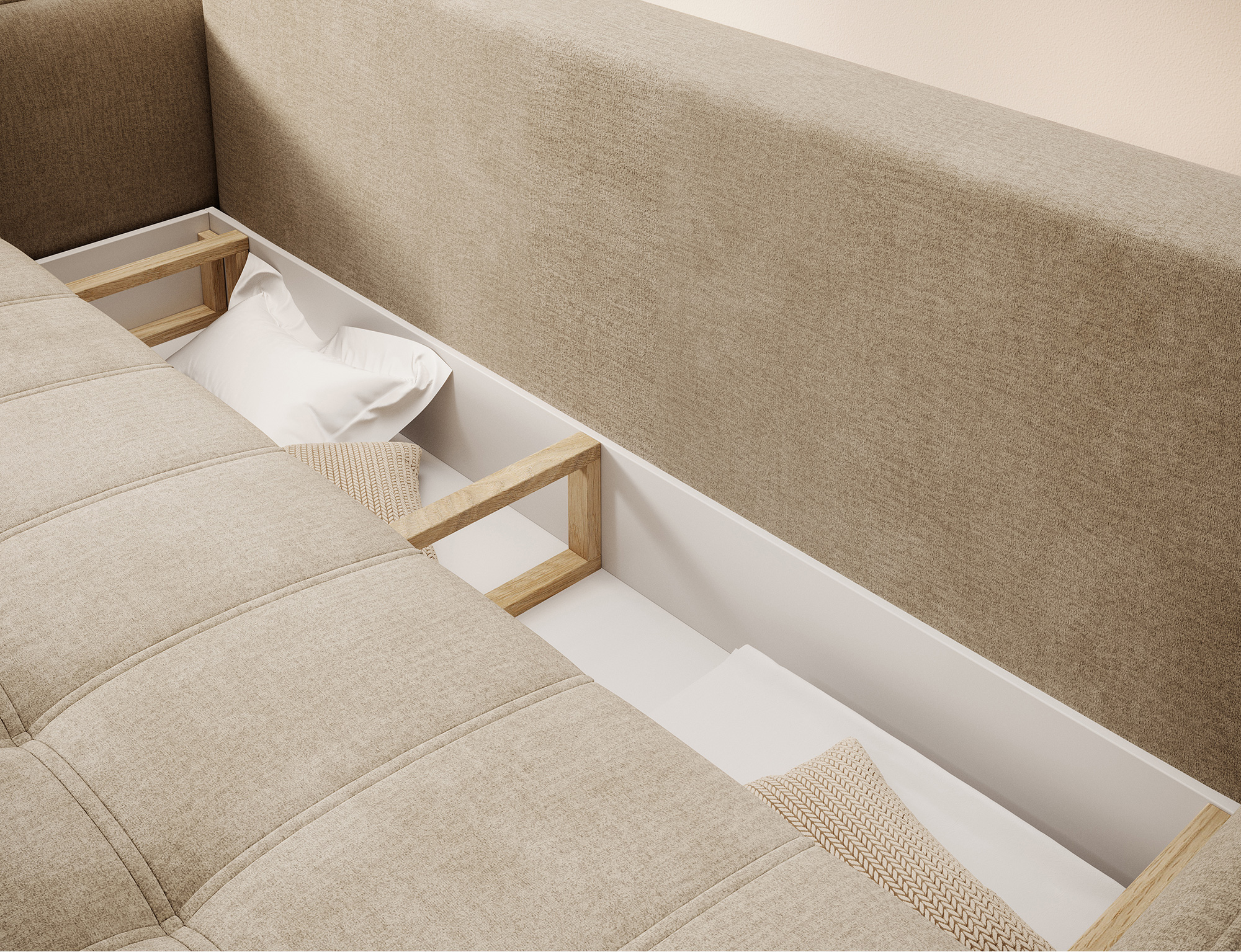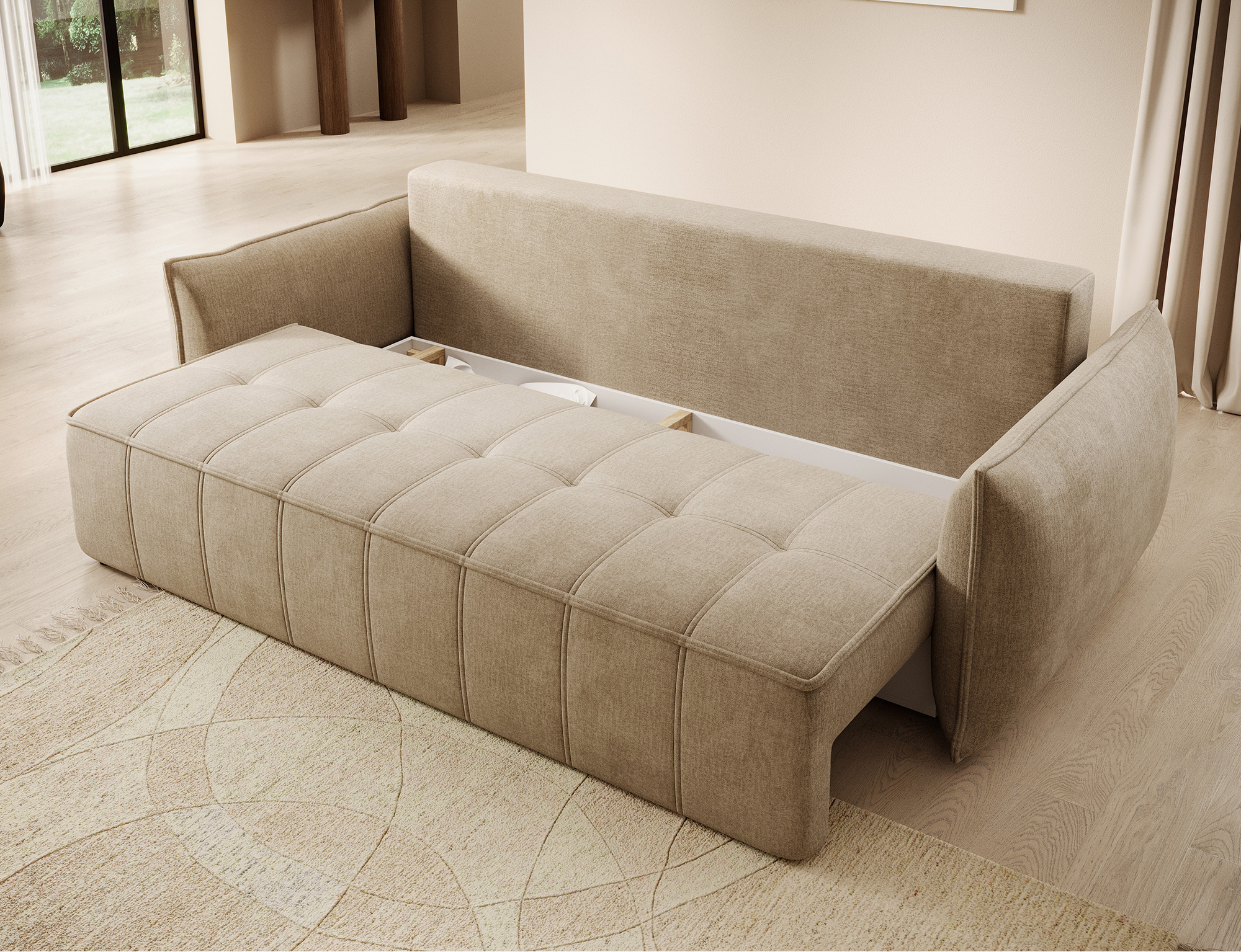 Mit dem DL-Ausziehmechanismus lässt sich Wilson einfach und schnell in ein Gästebett mit 200×140 cm Liegefläche verwandeln. Der integrierte Bettkasten (198×60×19 cm) schafft zusätzlichen Stauraum für Decken und Kissen.