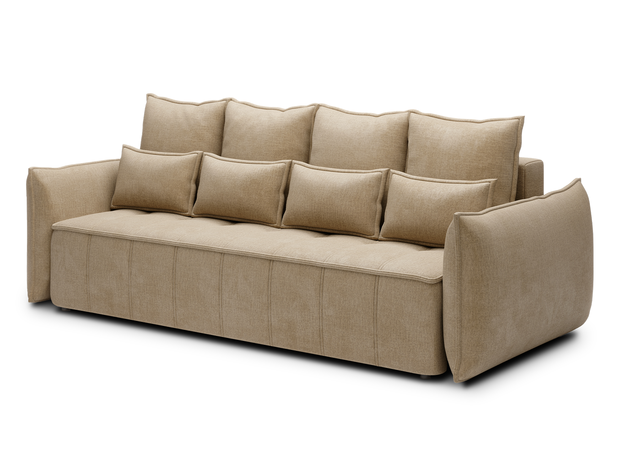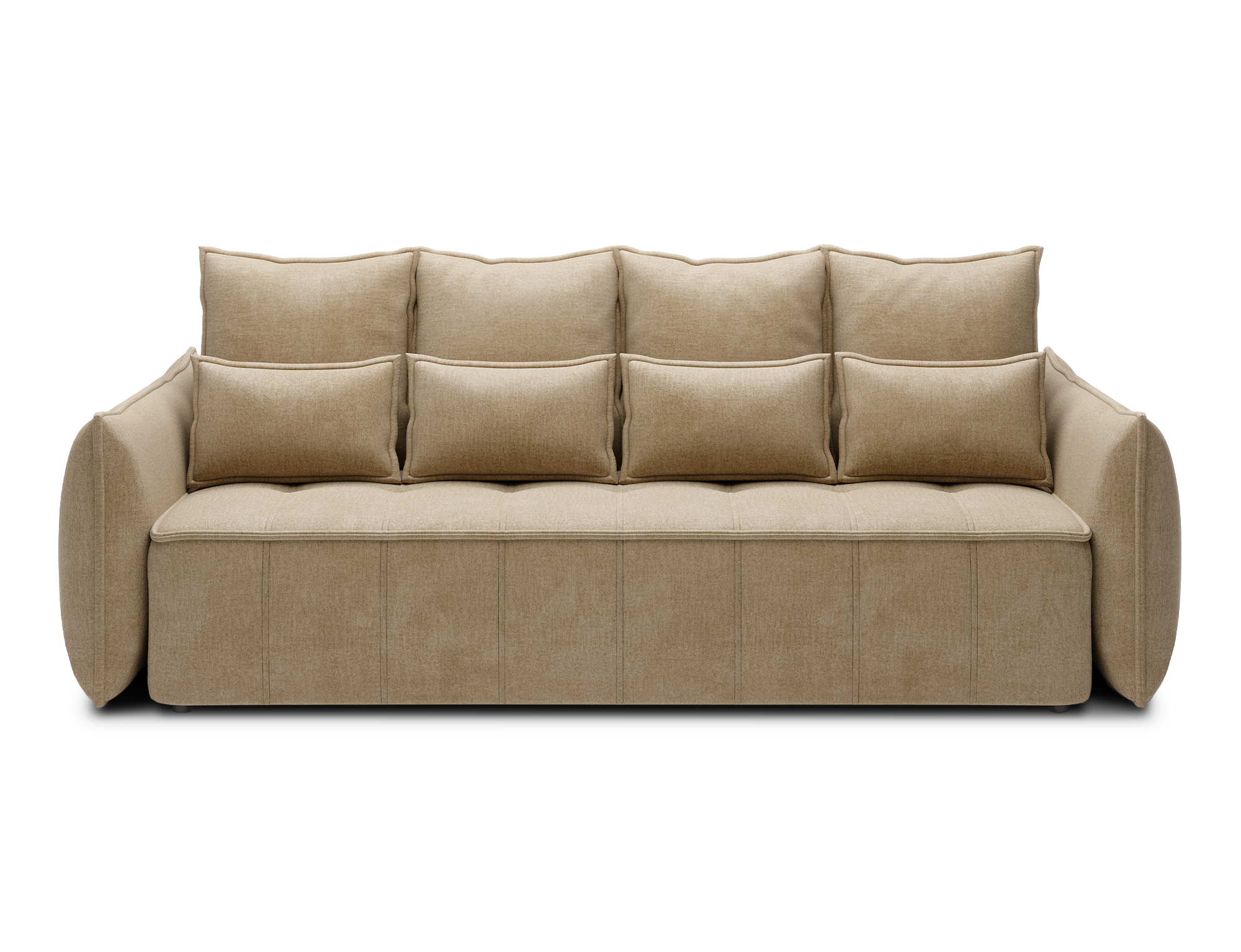 Die schwarzen Kunststofffüße und die rundum gepolsterte Rückseite machen das Sofa sowohl optisch als auch funktional zur idealen Wahl – frei im Raum platzierbar.