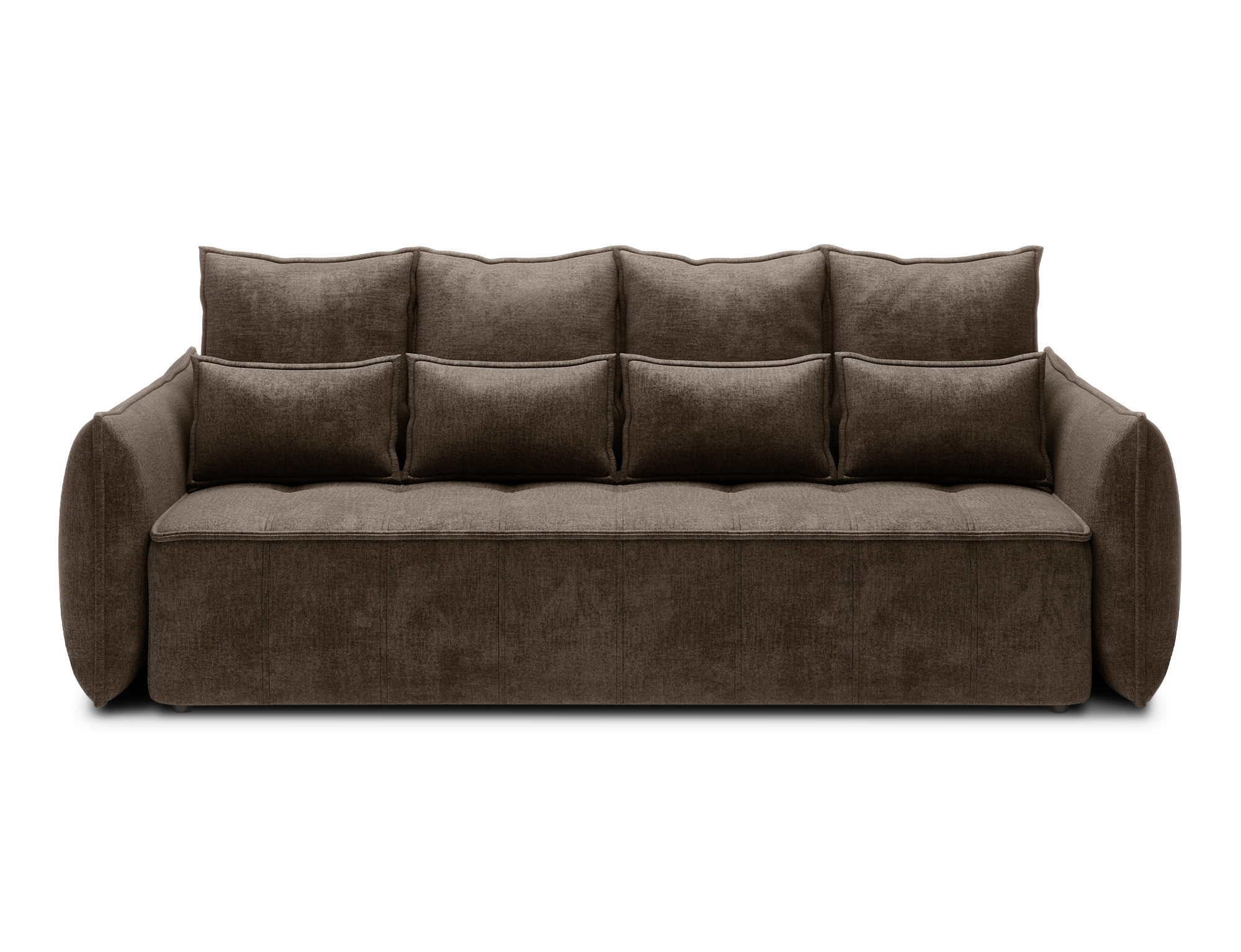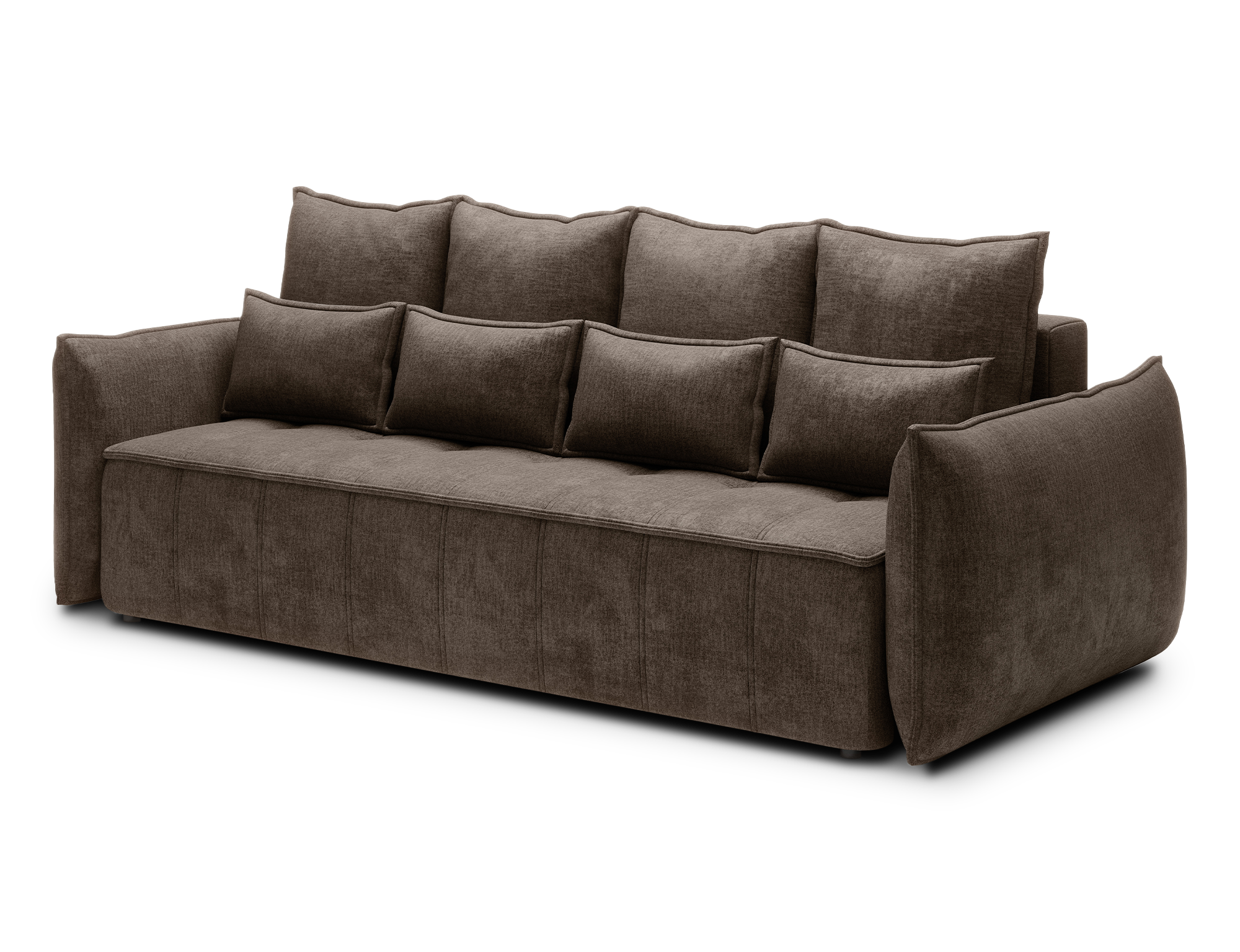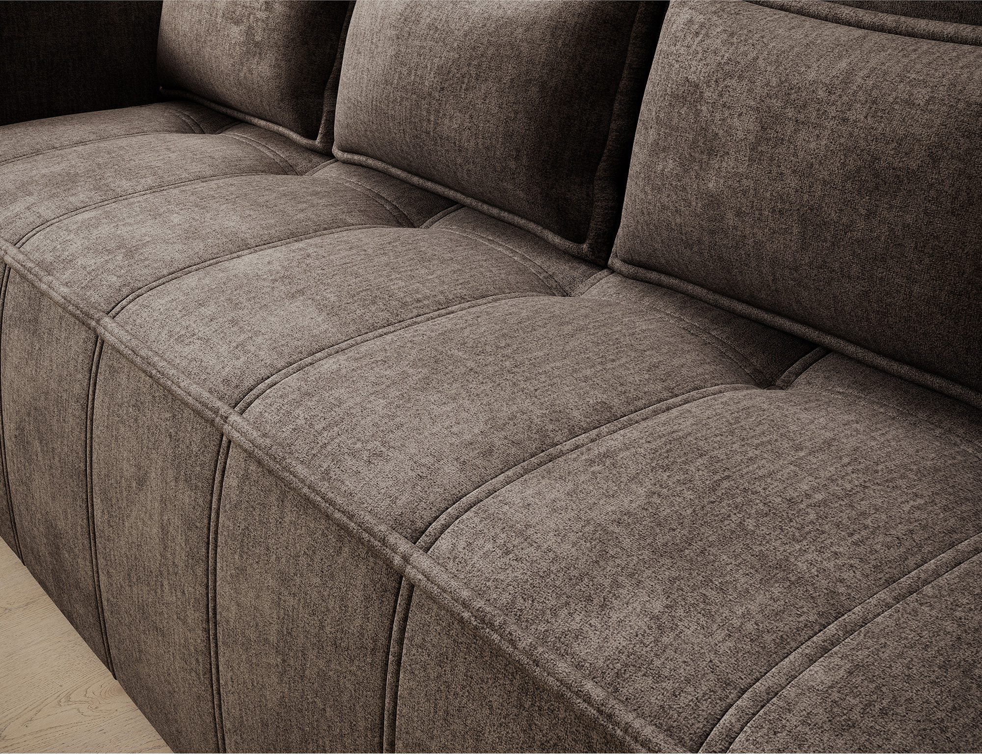 Die schwarzen Kunststofffüße und die rundum gepolsterte Rückseite machen das Sofa sowohl optisch als auch funktional zur idealen Wahl – frei im Raum platzierbar.