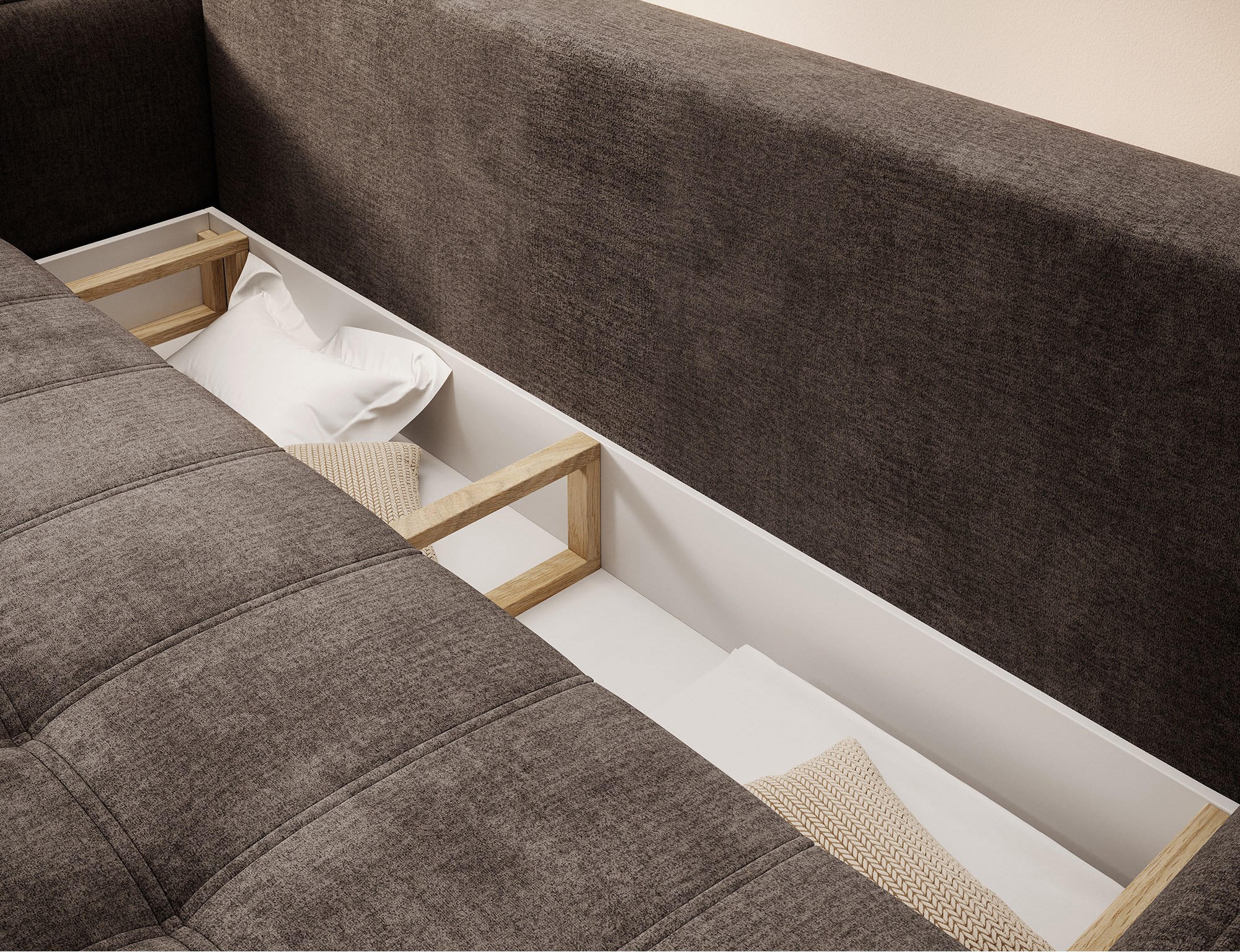 Mit dem DL-Ausziehmechanismus lässt sich Wilson einfach und schnell in ein Gästebett mit 200×140 cm Liegefläche verwandeln. Der integrierte Bettkasten (198×60×19 cm) schafft zusätzlichen Stauraum für Decken und Kissen.