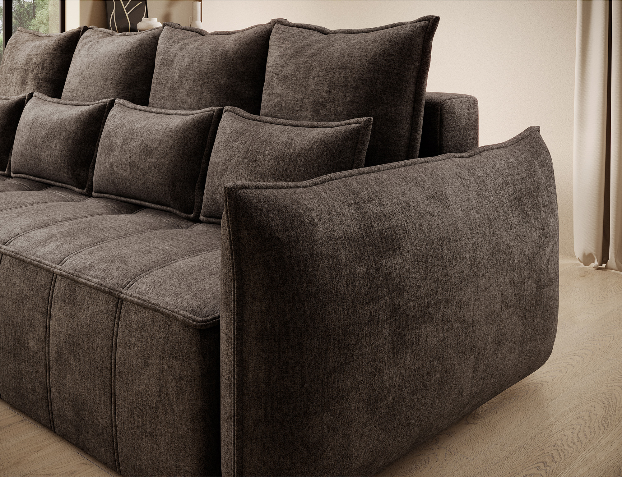 Die großzügige Sitzfläche mit HR-Schaum (hochflexibel) bietet optimalen Komfort und bleibt auch bei täglicher Nutzung formstabil. Die Rückenlehne mit abnehmbaren Kissen, gefüllt mit Schaumstoffgranulat, sorgt für entspanntes Zurücklehnen.