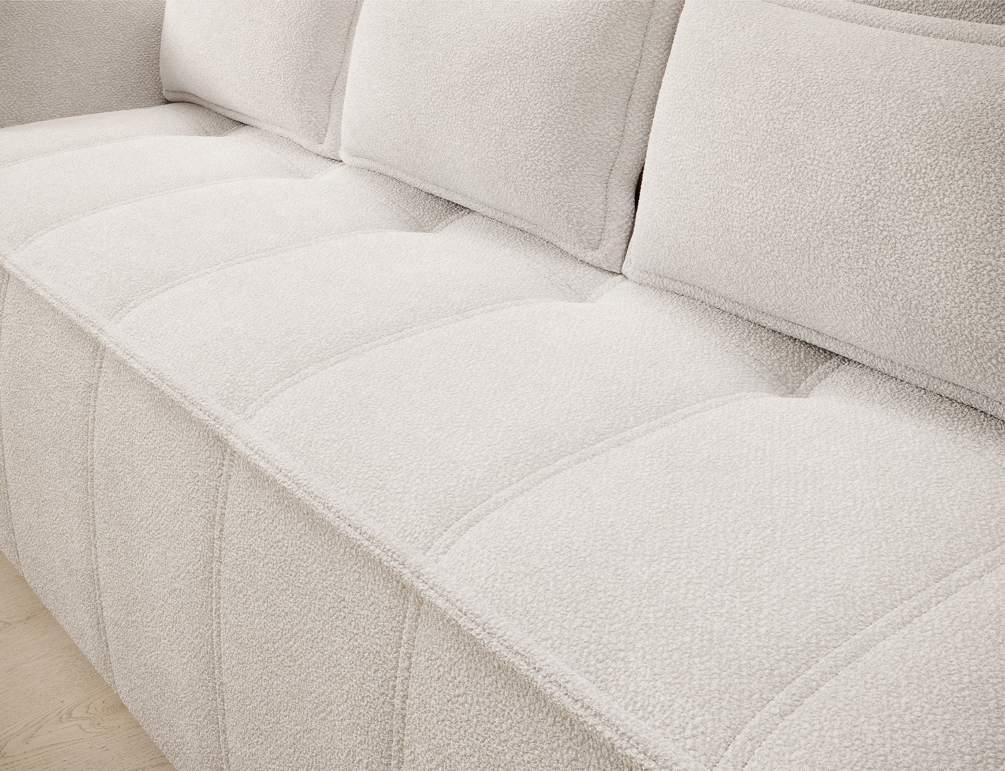 Das 3-Sitzer Sofa Wilson kombiniert modernen Komfort mit hochwertiger Optik. Der edle Bouclé-Samt-Mix aus 100 % Polyester verleiht dem Sofa sowohl eine strukturierte Oberfläche als auch einen leichten Glanz – für eine stilvolle, aber gemütliche Ausstrahlung.