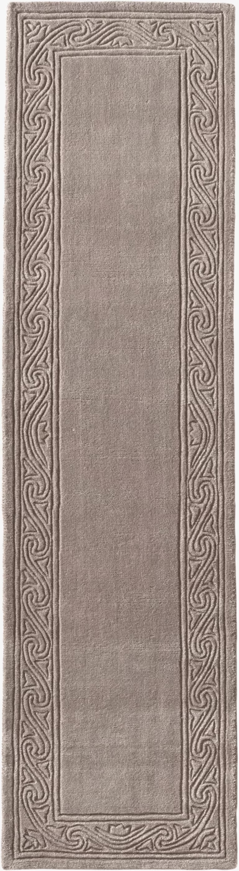 Dieser luxuriöse Hochflorteppich besticht durch seine aufwendige Relief-Bordüre und ist von Hand geschnitten sowie handgewebt. Nachhaltig produziert mit Good Weave-Zertifizierung, aus 100% Wolle. Farbe: grau, Florhöhe 20 mm. Maße: 160x90 cm.
