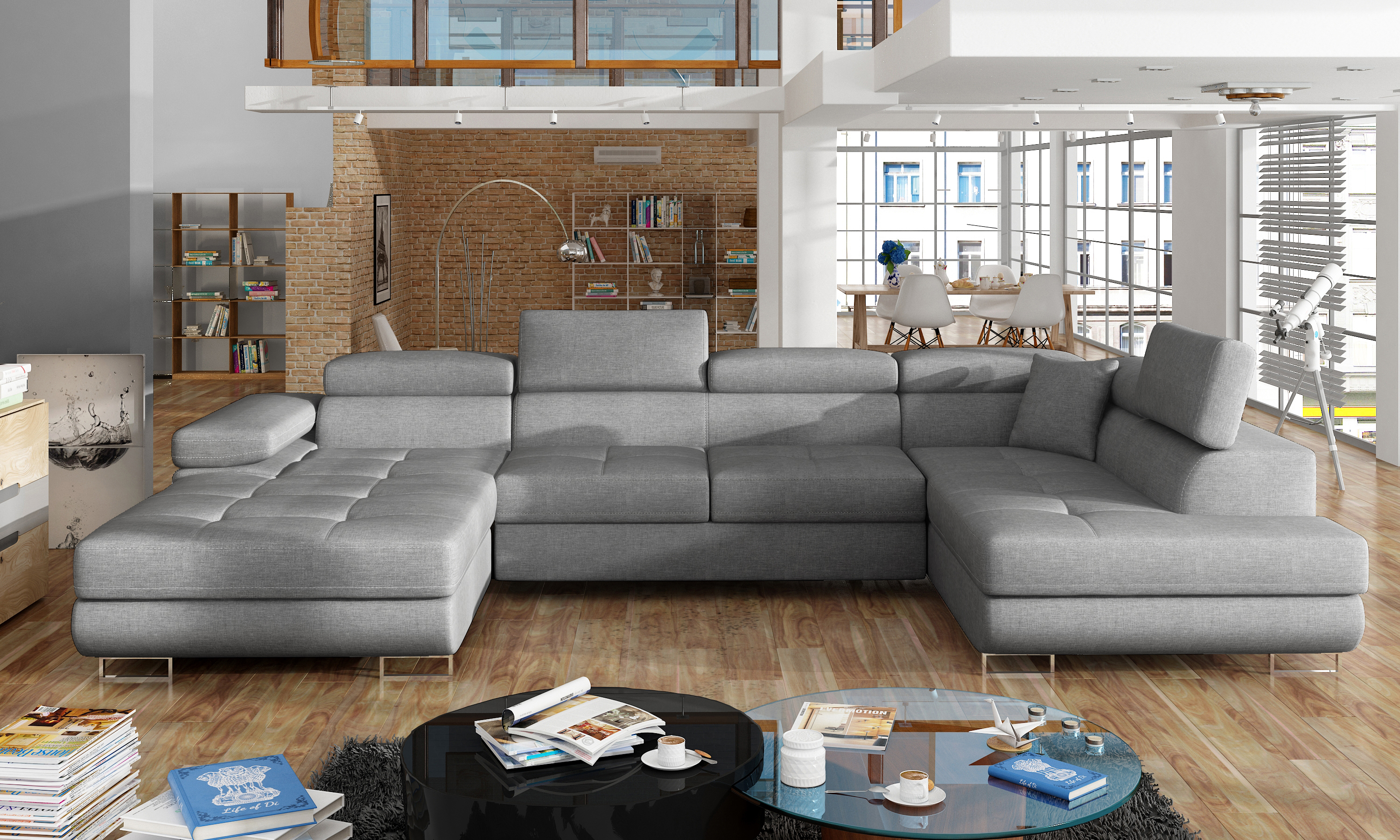 Tauchen Sie ein in den modernen Komfort und zeitlosen Stil mit der Wohnlandschaft Rico. Diese elegante Möbelstück ist nicht nur ein ästhetisches Highlight in Ihrem Wohnzimmer, sondern bietet auch herausragende Funktionalität. Die Wohnlandschaft Rico überzeugt mit einer praktischen Bettfunktion und einem großzügigen Bettkasten, sodass sie im Handumdrehen zu einer gemütlichen Schlafgelegenheit für Übernachtungsgäste wird. Die großzügige Liegefläche und die hochwertige Wellenunterfederung sorgen dabei für erholsamen Schlafkomfort. Das moderne Design wird durch die stilvollen Metallfüße unterstrichen, die nicht nur für Stabilität, sondern auch für eine elegante Optik sorgen. Zusätzlich ermöglicht die Kopfteilverstellung individuellen Komfort und Flexibilität beim Entspannen. Entdecken Sie mit der Wohnlandschaft Rico die perfekte Kombination aus Stil, Funktionalität und Komfort für Ihr Zuhause und verwandeln Sie Ihr Wohnzimmer in eine wahre Wohlfühloase.