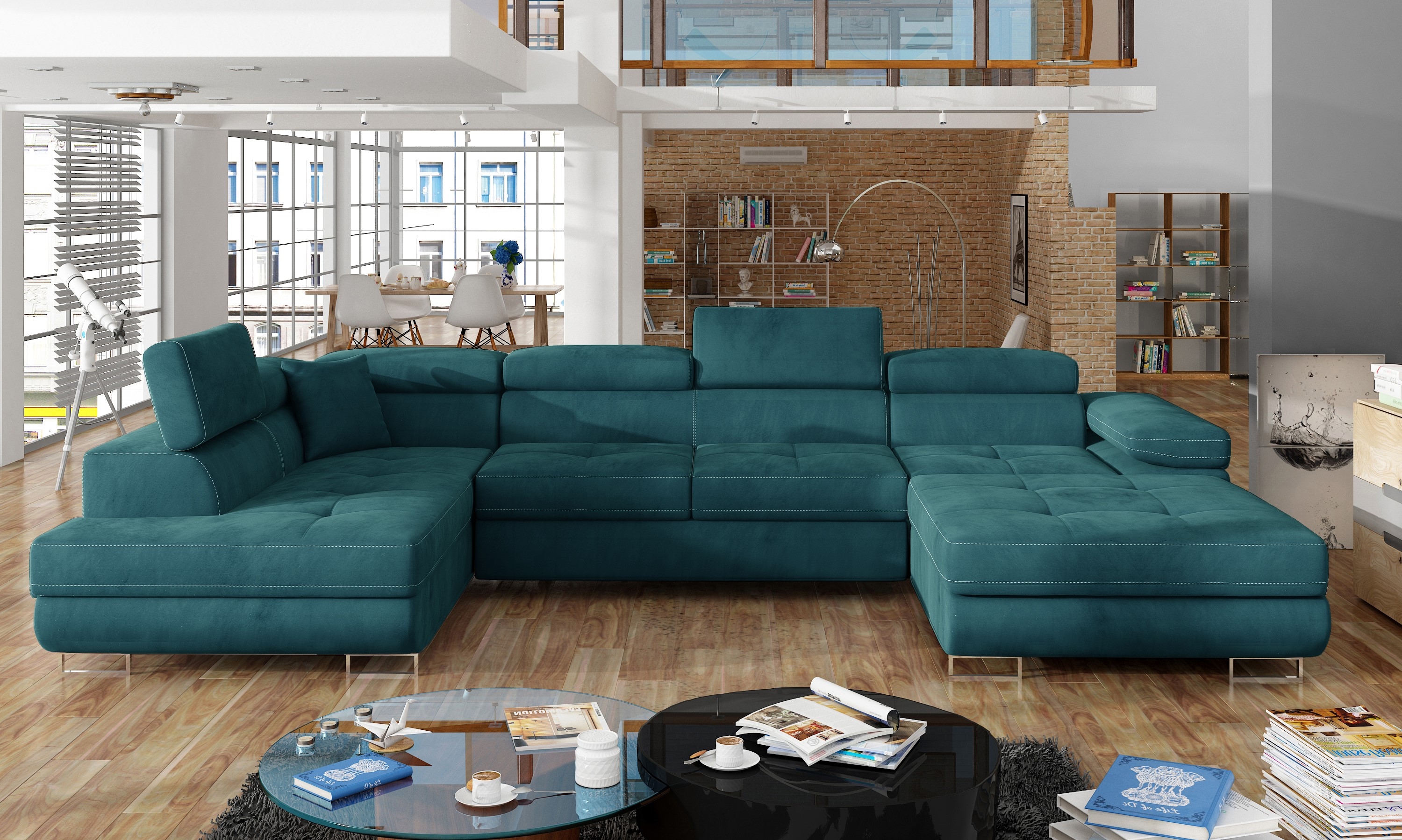 Tauchen Sie ein in den modernen Komfort und zeitlosen Stil mit der Wohnlandschaft Rico. Diese elegante Möbelstück ist nicht nur ein ästhetisches Highlight in Ihrem Wohnzimmer, sondern bietet auch herausragende Funktionalität. Die Wohnlandschaft Rico überzeugt mit einer praktischen Bettfunktion und einem großzügigen Bettkasten, sodass sie im Handumdrehen zu einer gemütlichen Schlafgelegenheit für Übernachtungsgäste wird. Die großzügige Liegefläche und die hochwertige Wellenunterfederung sorgen dabei für erholsamen Schlafkomfort. Das moderne Design wird durch die stilvollen Metallfüße unterstrichen, die nicht nur für Stabilität, sondern auch für eine elegante Optik sorgen. Zusätzlich ermöglicht die Kopfteilverstellung individuellen Komfort und Flexibilität beim Entspannen. Entdecken Sie mit der Wohnlandschaft Rico die perfekte Kombination aus Stil, Funktionalität und Komfort für Ihr Zuhause und verwandeln Sie Ihr Wohnzimmer in eine wahre Wohlfühloase.